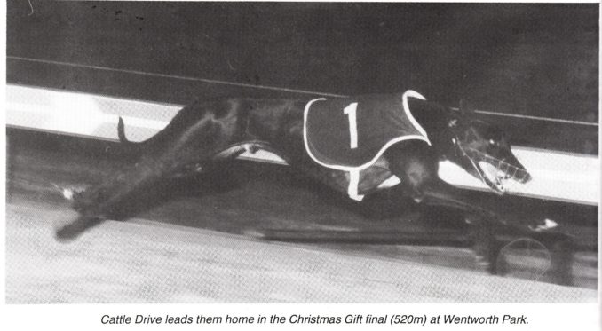 Some dogs race extremely well away from home. One such chaser was Cattle Drive he raced at Wentworth Park on many occasions. Always in top company he won the 1996 National Derby and Christmas Gift. He was raced by Greg Bennett from Devon Meadows. He also won at Sandown, Olympic Park, Cranbourne and Traralgon.