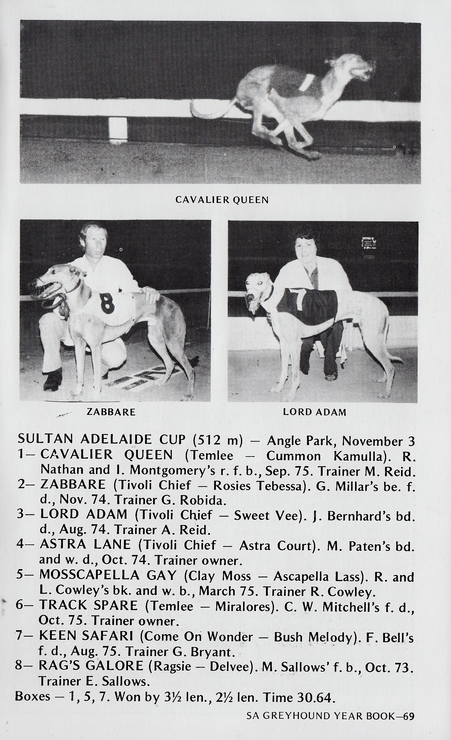 1977 Laurels and Adelaide Cup winner Cavalier Queen September 1975 (Temlee x Cummon Kamulla). Trained by Mick Reid continuing the dynasty. Lovely bloke Mick like all the Reid’s. Most of the boys worked at Sandown, Mick 12 years, six as Lure Driver. She loved Sandown Park she also made the 1977 Melbourne Cup won by Mile Post as usual a crack field Mandaquita, Satan’s Legend, Temora Belle, Emiline Bale, Dusty Progress and Belabour Prince. Also found the below page in the 1977 South Australian Year Book. Adelaide Cup that year was won by Victorian Cavalier Queen for Mick Reid one of the famous Reid family. Second was Zabbare a dog raced by a group from Sandy Footy club led by ex Sandown CEO Greg Miller. Couple of other Victorians in the final Lord Adam trained by Hall of Famer the late Alec Reid, Keen Safari trained by another Hall of Famer the late Ned Bryant and Rag’s Galore trained by another superstar with a lead and collar the late Teddy Sallows.