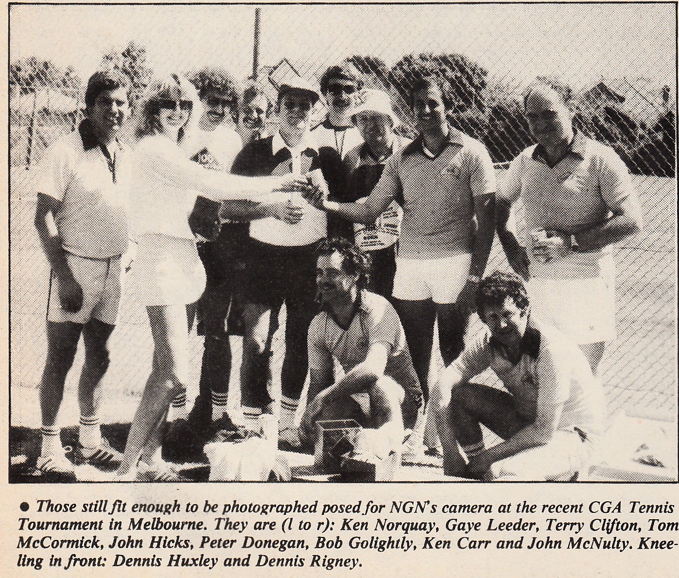At a number of AGRA – GCA Nationals I remember they had many very spirted Golf tournaments. Well back in 81 the then CGA had a Tennis tournament in Melbourne. Thought it was topical given the rubbish going here in regard to the Australian Open at the moment. A couple of our members took part there’s Kenny Norquay far left and Hucca in front.