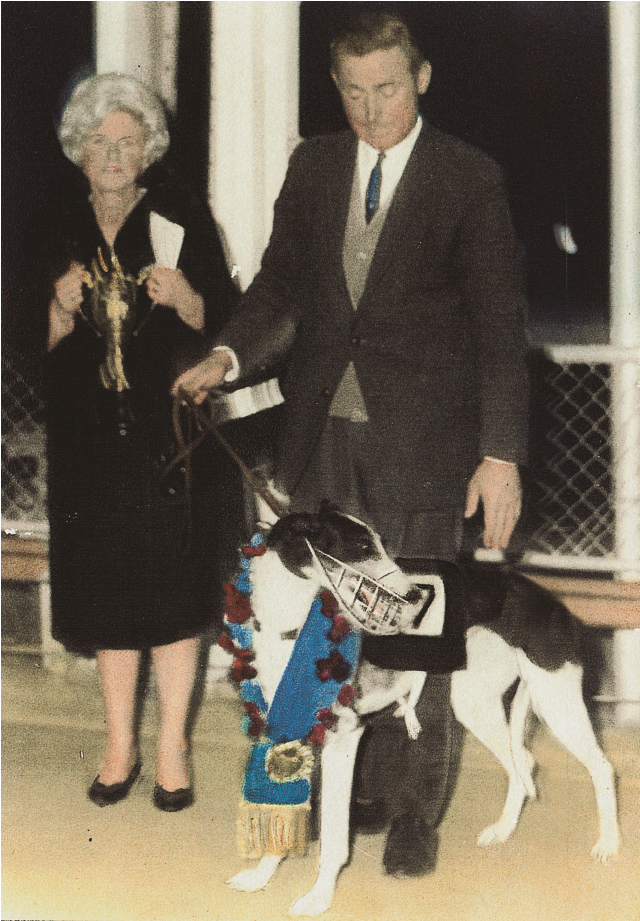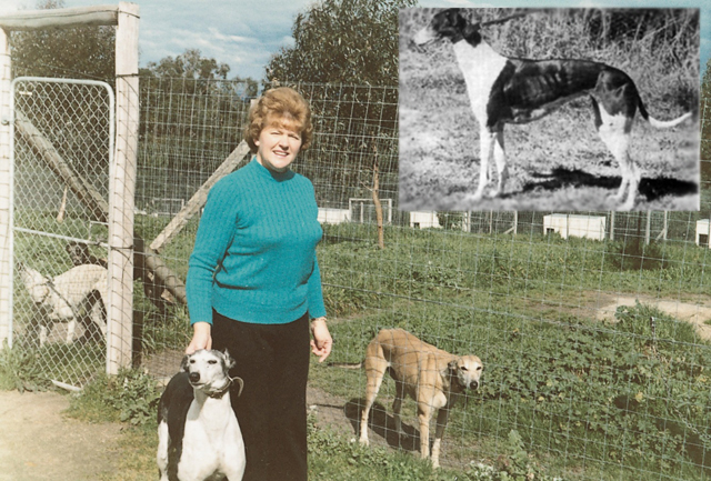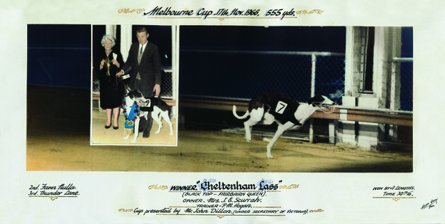 Cheltenham Lass was trained by leading Victorian mentor and Hall of Fame inductee Sandown Director of 33 years Paul Hogan. She was raced by Lal and Jean Scurrah. Cheltenham Lass raced 43 times for 16 wins and 13 placings she was the winner of the 1965 Group 1 Laurels, Runner-up 1965 Group 1 Melbourne Cup, Winner 1966 Group 1, Melbourne Cup, Runner-up 1966 Group 1 Australian Cup and Runner-up 1967 Group 1 Australian Cup. Rated the best race bitch of her era she was a distinctive white & black colour her kennel name was Magpie.