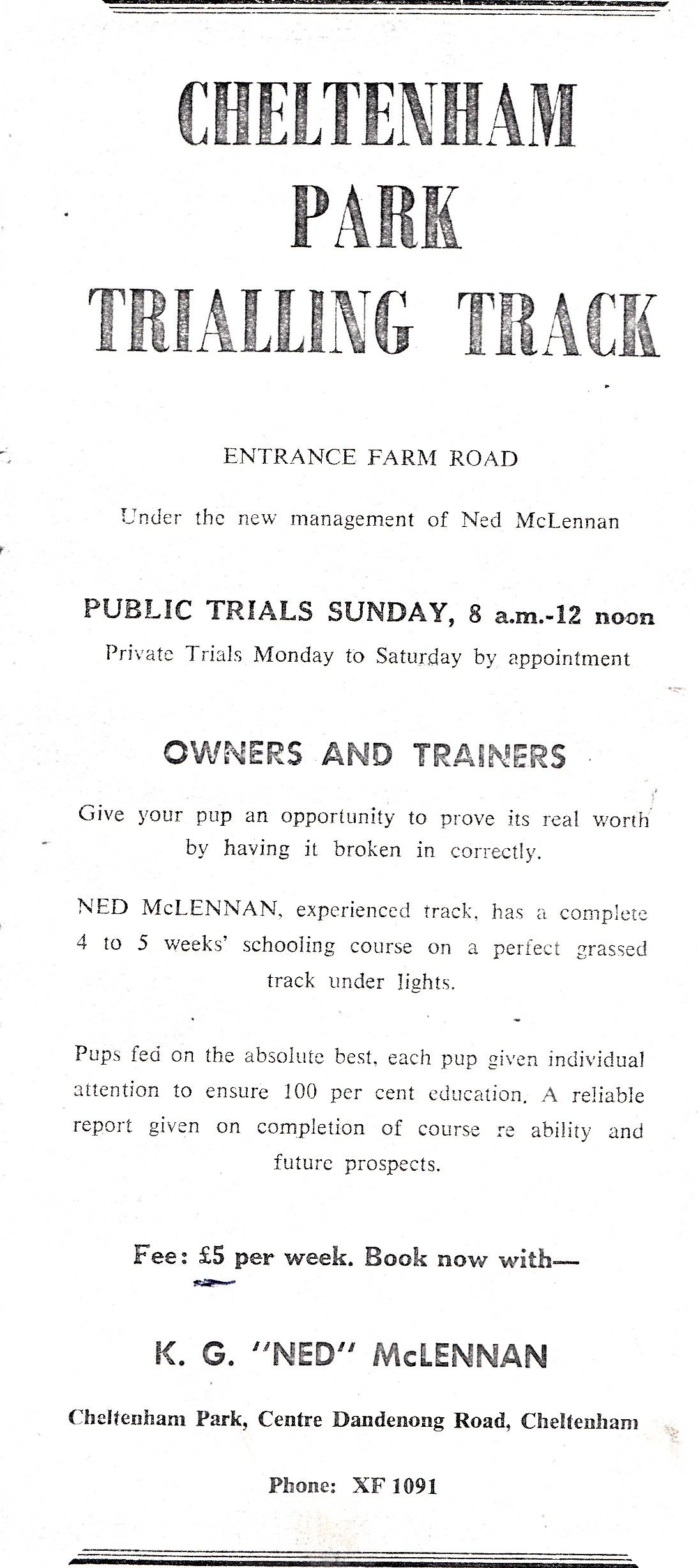 I am sure many Victorian owners and trainers will remember attending Cheltenham Park. Purchased by Lavithan Bookmaker Lal Scurrah and managed by Hall of fame trainer Paul Hogan here is an ad for the place under the new management of Ned McLennan. I am not sure of the year. But found the ad alongside one for Bookmaker Scurrah and the legendary Chummy Parkes in a publication called the Victorian Greyhound Review.