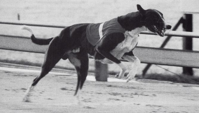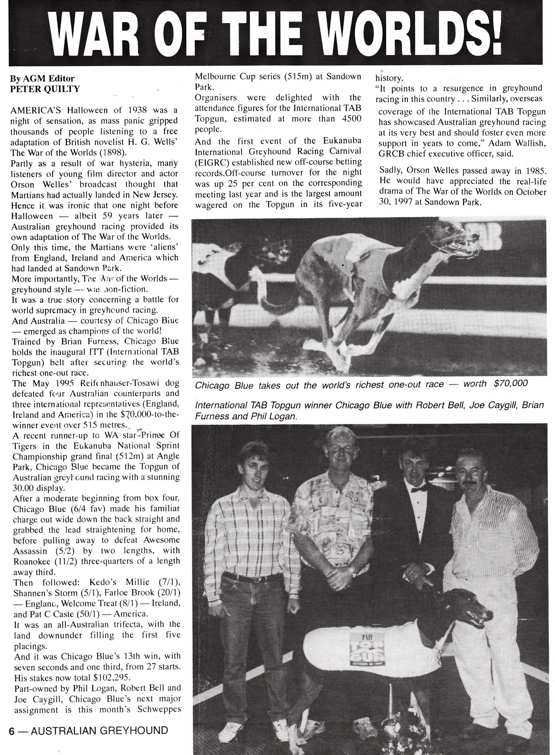 The first International Top Gun winner Chicago Blue. The Blue & White May 1995 dog by Reifenhauser from Tosawi. A top performer he also the 1997 Gold Collar. In a career of 51 starts for 15 wins and 18 placings he won approx. $133,960. Bred and raced by Phil Logan he was also part owned by Robert Bell and Joe Caygill. Trained by Brian Furness he also won at Cranbourne, Angle Park, Wentworth Park, Wangaratta and Shepparton. The Top Gun run on a wet night included in finishing order Awesome Assassin, Roanokee, Kedo’s Millie, Shannen’s Storm. Token Prince was scratched. The overseas dogs were the last three home. Farloe Brook, Welcome Treat and the much-acclaimed Pat C Caste. The American stayed and raced only winning twice at Ballarat once in best of the night 25.76.