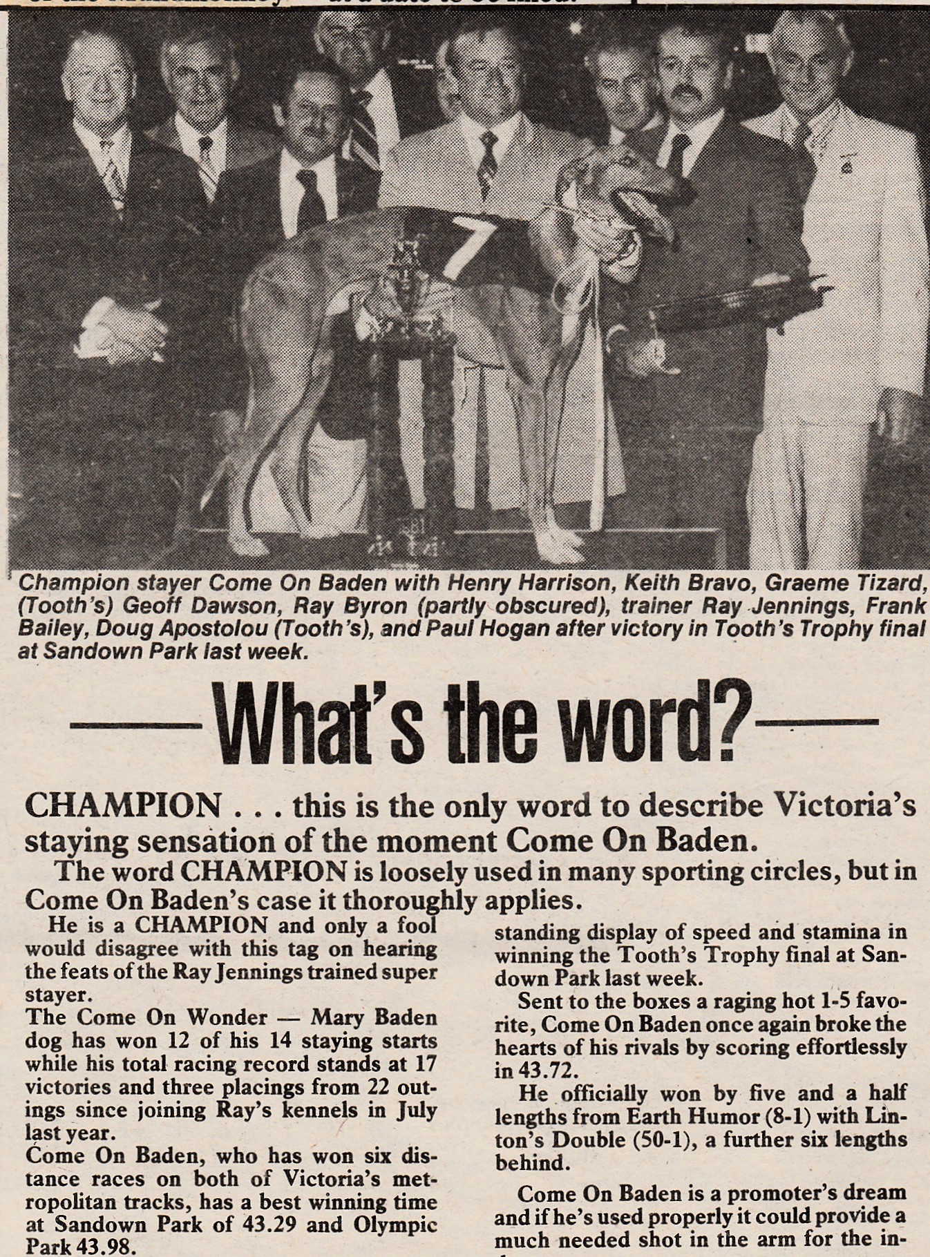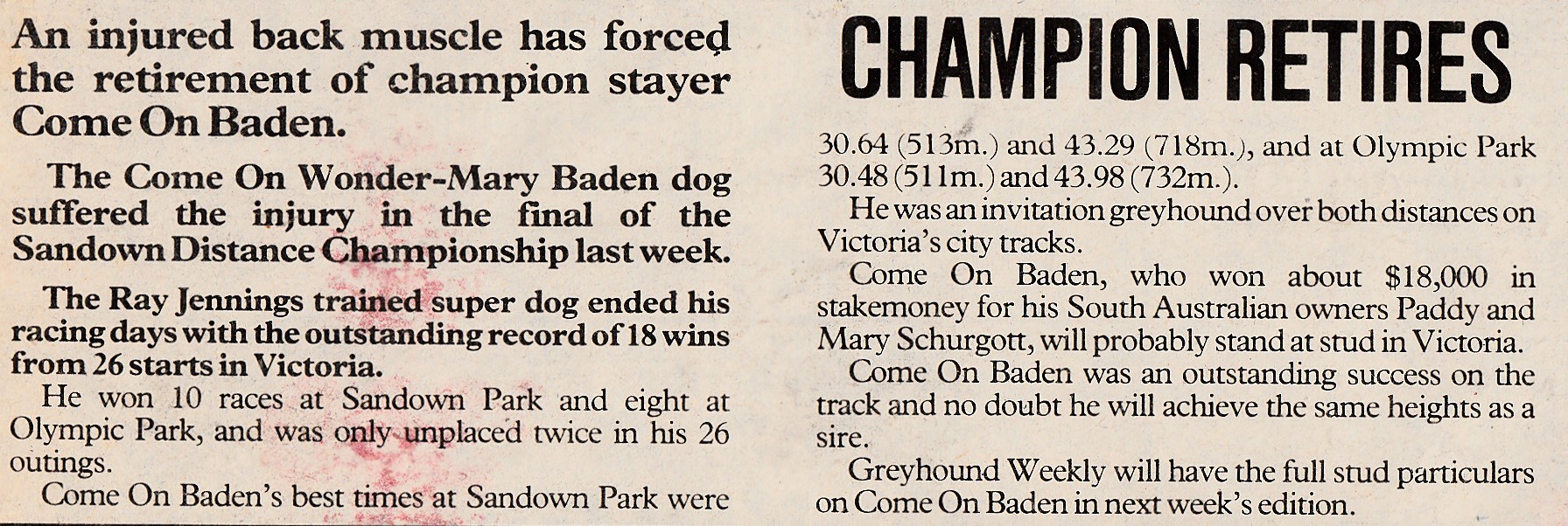 Ray Jennings brilliant stayer Come On Baden.