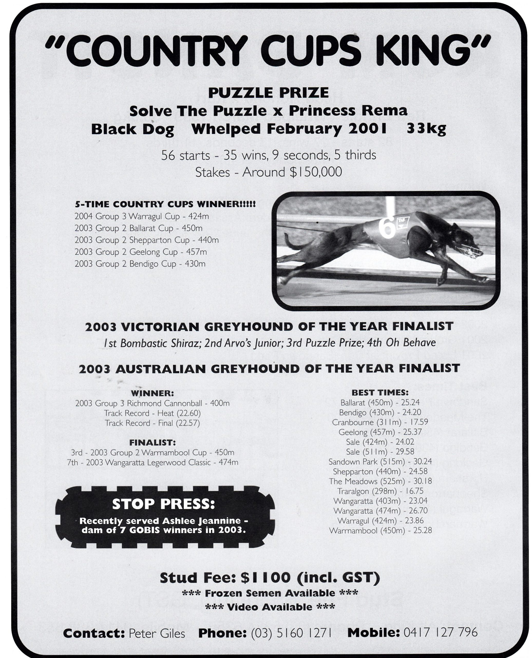 The king of the Country Cups Puzzle Prize. Has any dog won more. Ballarat, Bendigo, Shepparton, Geelong in 2003. 2004 Warragul Cup. 55 starts 34 wins and 15 placings. $137,450. Won 10 of his last 11 starts. Another star for Peter Giles by Solve The Puzzle frpm Princess Rema.