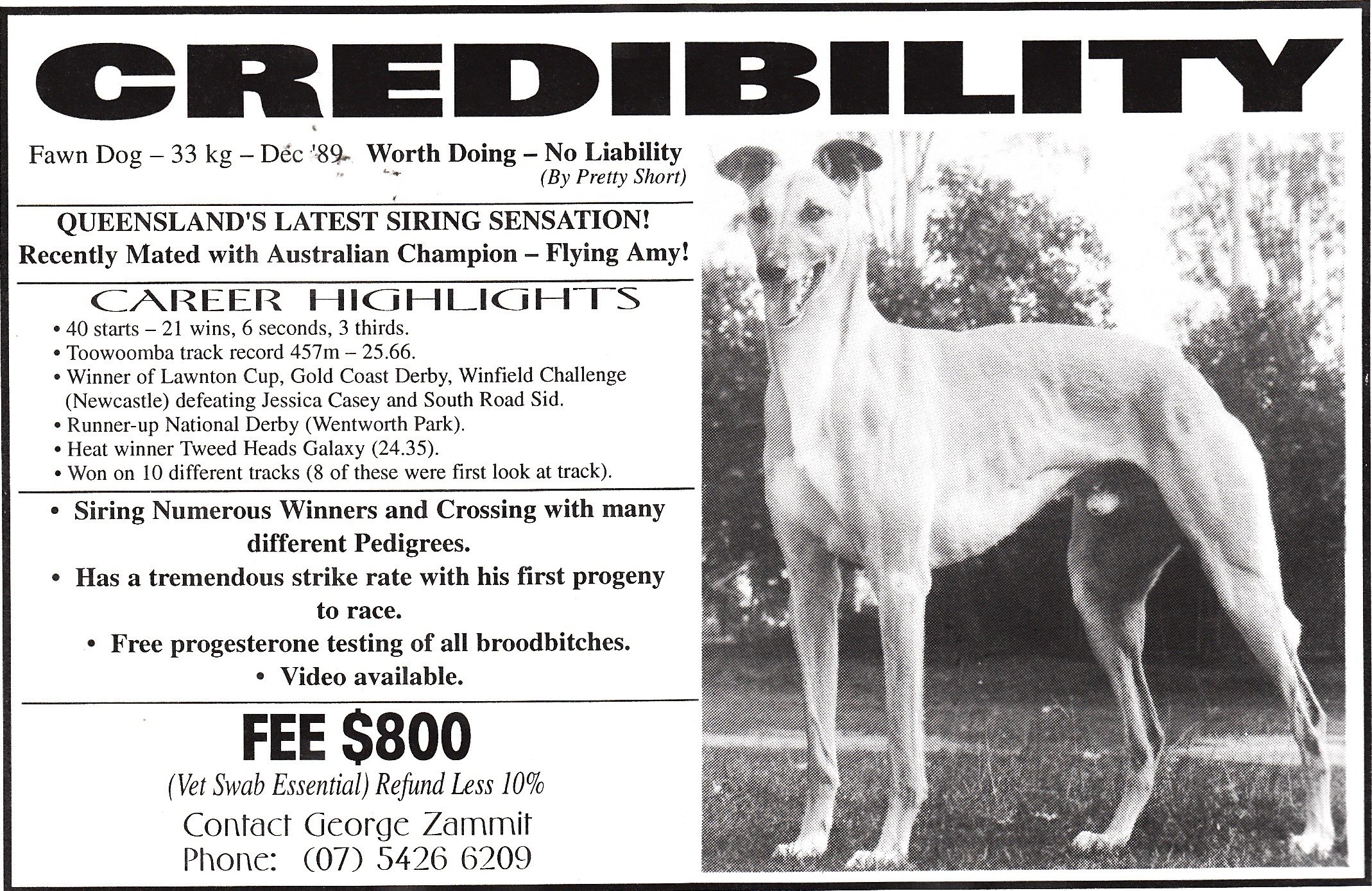 Top class Queenslander Credibility. I have included a video of the Winfield Challenge from Belmont Park Newcastle held on February 27th 1992 . Posted by Kyle Galley. Race commentary is provided by local legend Gary Harley. A fantastic finish sees Credibility hang on to beat the Great Jessica Casey and South Road Sid in a tight photo.