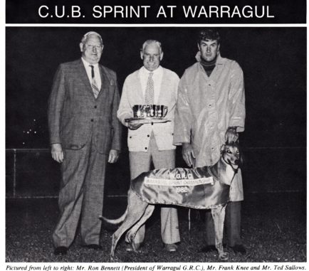 What about this presentation. Three top men in this photo Ron Bennett Warragul icon, Frank Knee and Teddy Sallows with Chief Kruger. He went 24.62 in the heat started fav at 5/4 beat a couple of smart dogs in the race final Conquistador and No More Duds in 24.95. 1983 CUB Sprint.