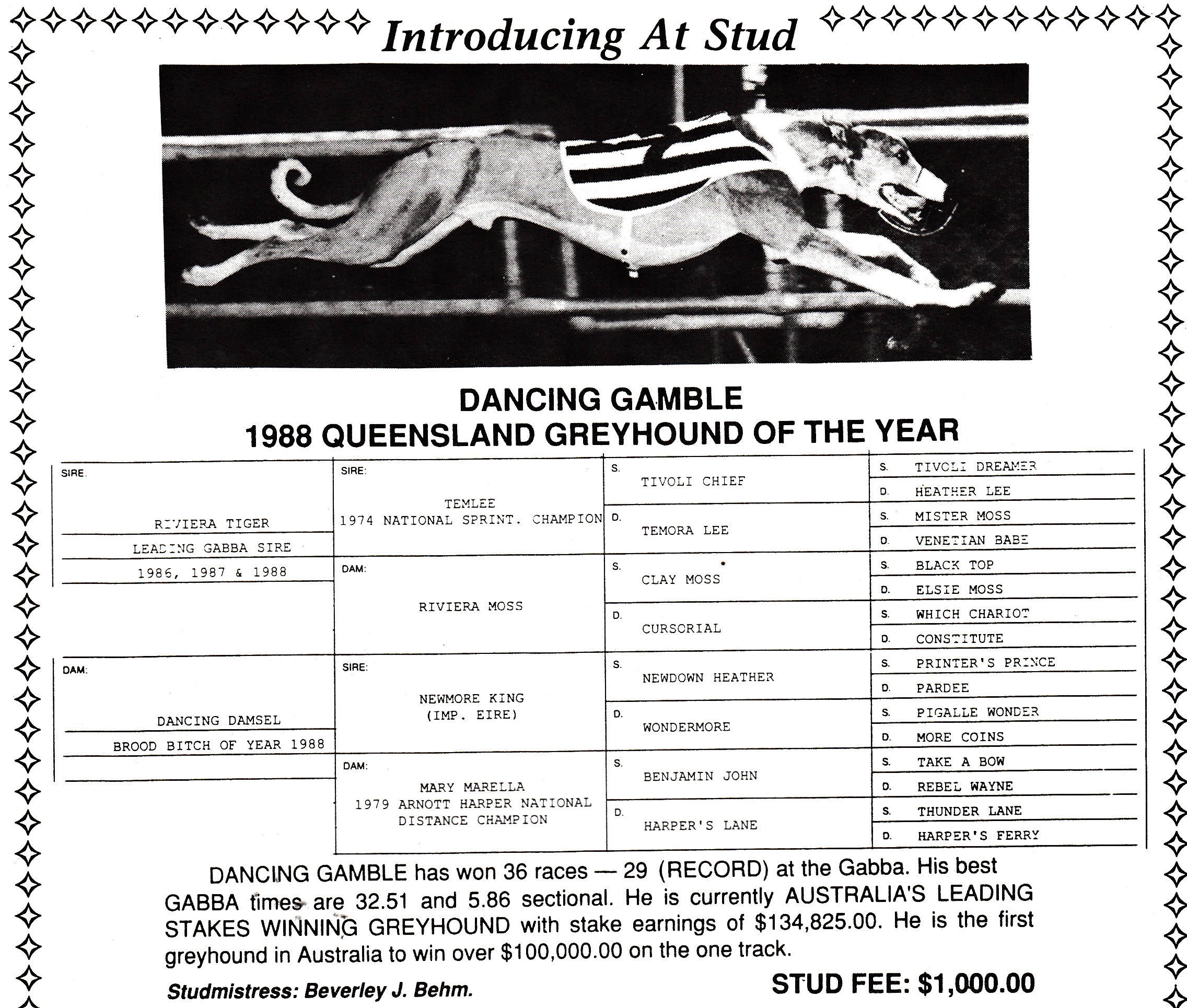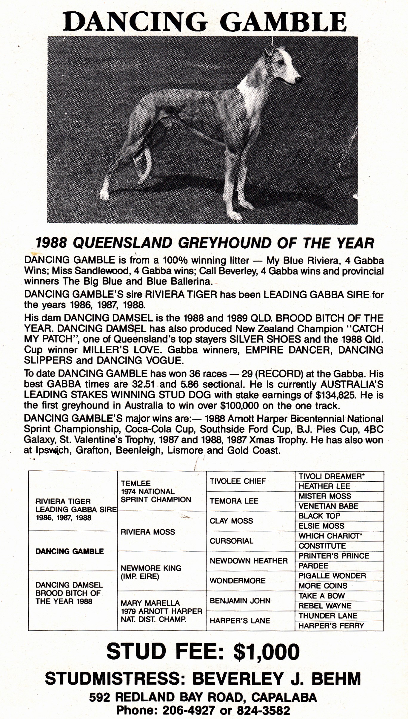 Dancing Gamble 22 April 2021 Neil Brown 80's 0 1988 Queensland Greyhound of the Year Dancing Gamble. Loved the Gabba.