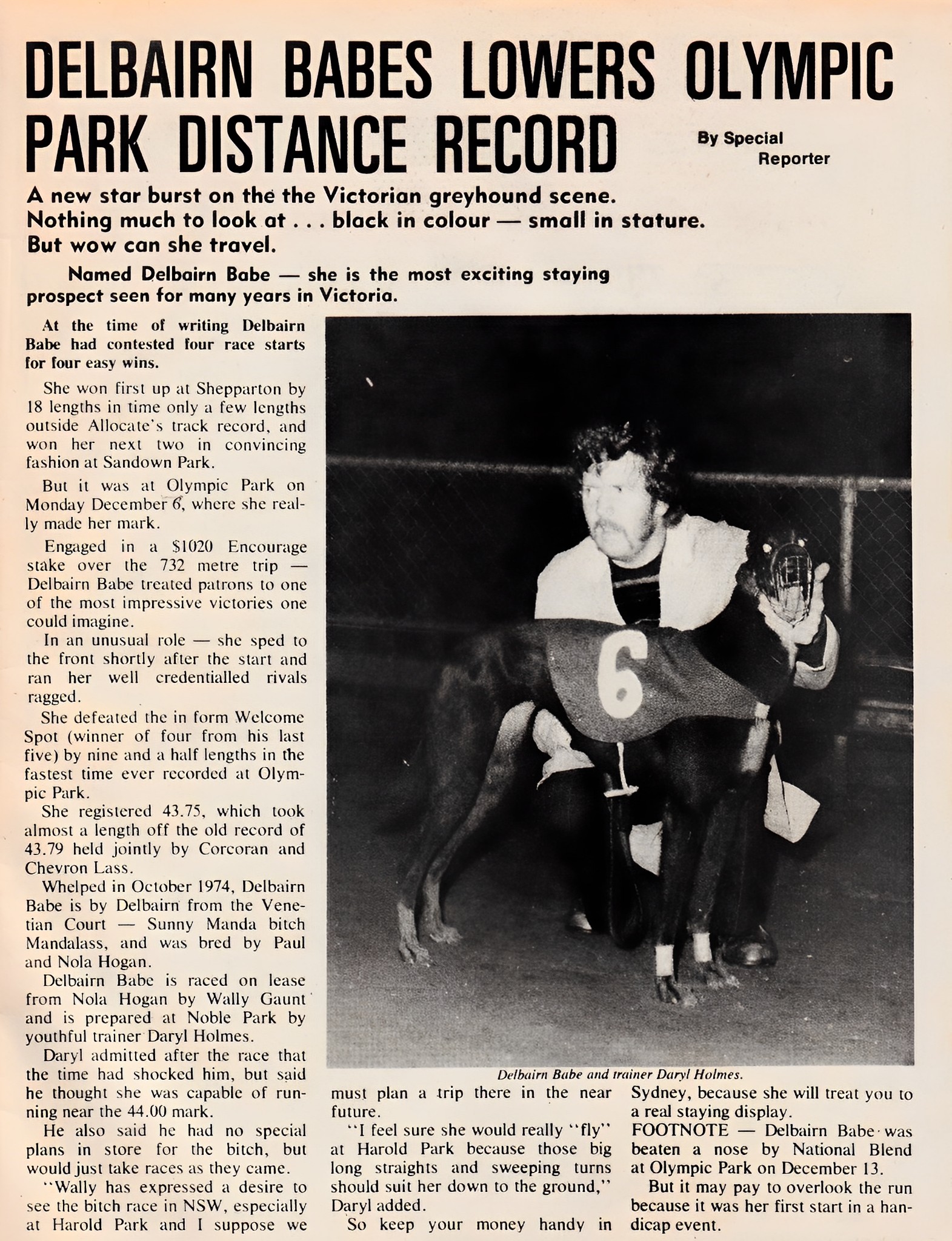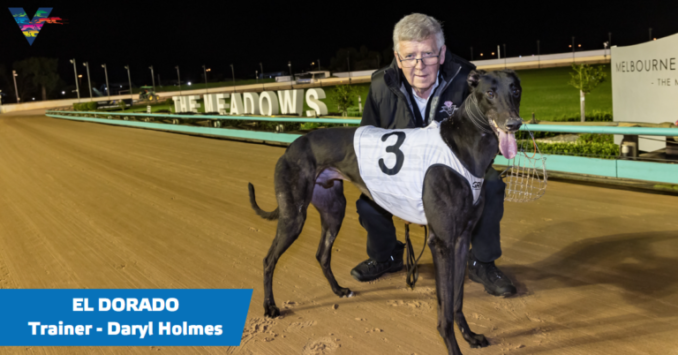 No surprise to see veteran trainer breeder administrator Daryl Holmes racing a quick dog with speedster El Dorado. He has recently recording some top city wins. In a long career full of highlights Daryl and his family go back to the 70’s when he trained outstanding stayer Delbairn Babe. A track record holder at Olympic Park she won the 1977 Maidment Memorial and the 77 Anniversary Trophy. She went on to become a great producer with litters to Tangaloa, Bowetzel, Chief Dingaan and Dynamic Dean. Her best pup without doubt was the mighty race and stud dog Tangairn. Daryl also raced and bred with top class bitch Sarah’s Sanction, she produced Dark Horizon the dam of Daryl’s star performers and stud dogs Black Shiraz and Big Ginger Boy. Daryl also bred and raced 1999 Maturity winner Coriole she also won a Lizrene Classic and Easter Cup. I am sure there is another fast dog not far away and it’s great to see him still at it. He lived for a long period of time in my Suburb of Keysborough and I often bumped into him while exercising my dogs in my training days. No surprize that Daryl was awarded the 2023 Ken Carr Medal the highest honour bestowed on a partpant by the GRV in Victoria. When congratulating Daryl on the night I remarked that it was special that two of us from Keysborough had won the Ken Carr.