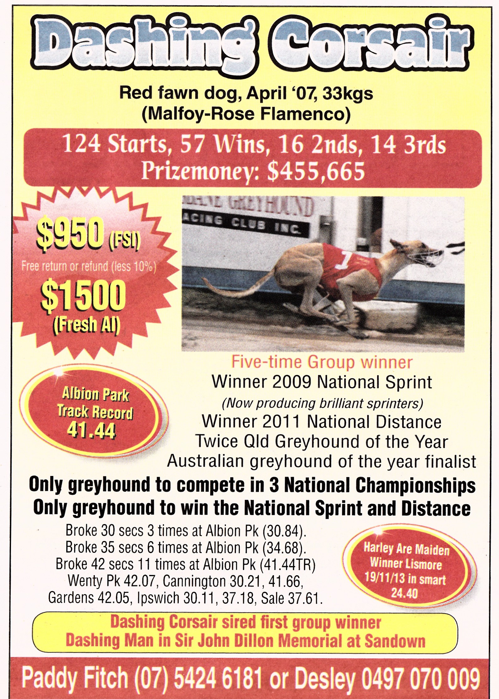 Dashing Corsair final tonight at Albion Park. He was an outstanding all distance performers. Dashing Corsair (Malfoy x Rose Flamenco) Red Fawn 19 APR 2007. Bred and Raced by Patty Fitch. Trained by Dwyer Lennon and Desley Williams. 124 Starts, 57 Wins, 16 2nds, 14 3rds Prizemoney: $455, 665. Five-time Group Winner. Won 2009 National Sprint, 2011 National Distance. Twice Qld Greyhound of the Year. Australian greyhound of the year finalist. Only greyhound to compete in 3 National Championships. Only greyhound to win the National Sprint and Distance. 2nd 2009 G1 Bris Cup; 2nd 2009 G2 WA Derby; 2nd 2009 G2 Gold Coast Cup; 3rd 2009 G2 Qld Derby; Finalist 2009 G1 Topgun, 18 Group Race Finals. Nine Group 1, Five Group 2, Four Group 3.