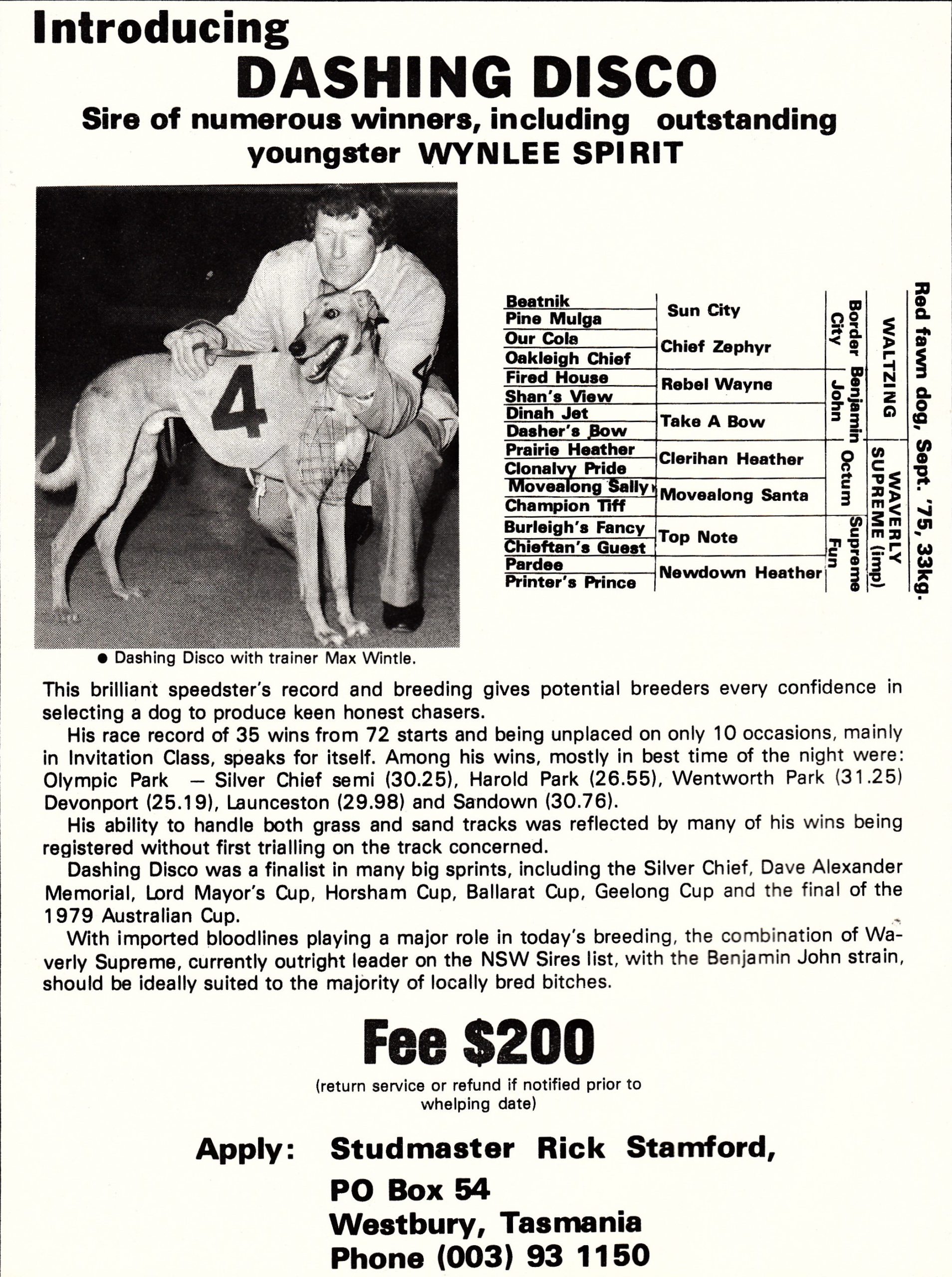 One of Max Wintles star performers of the middle 70’s was Dashing Disco. Turned out a pretty good sire as well. Stud master Rick Stamford still about Rick a household name in Tassie been around forever.