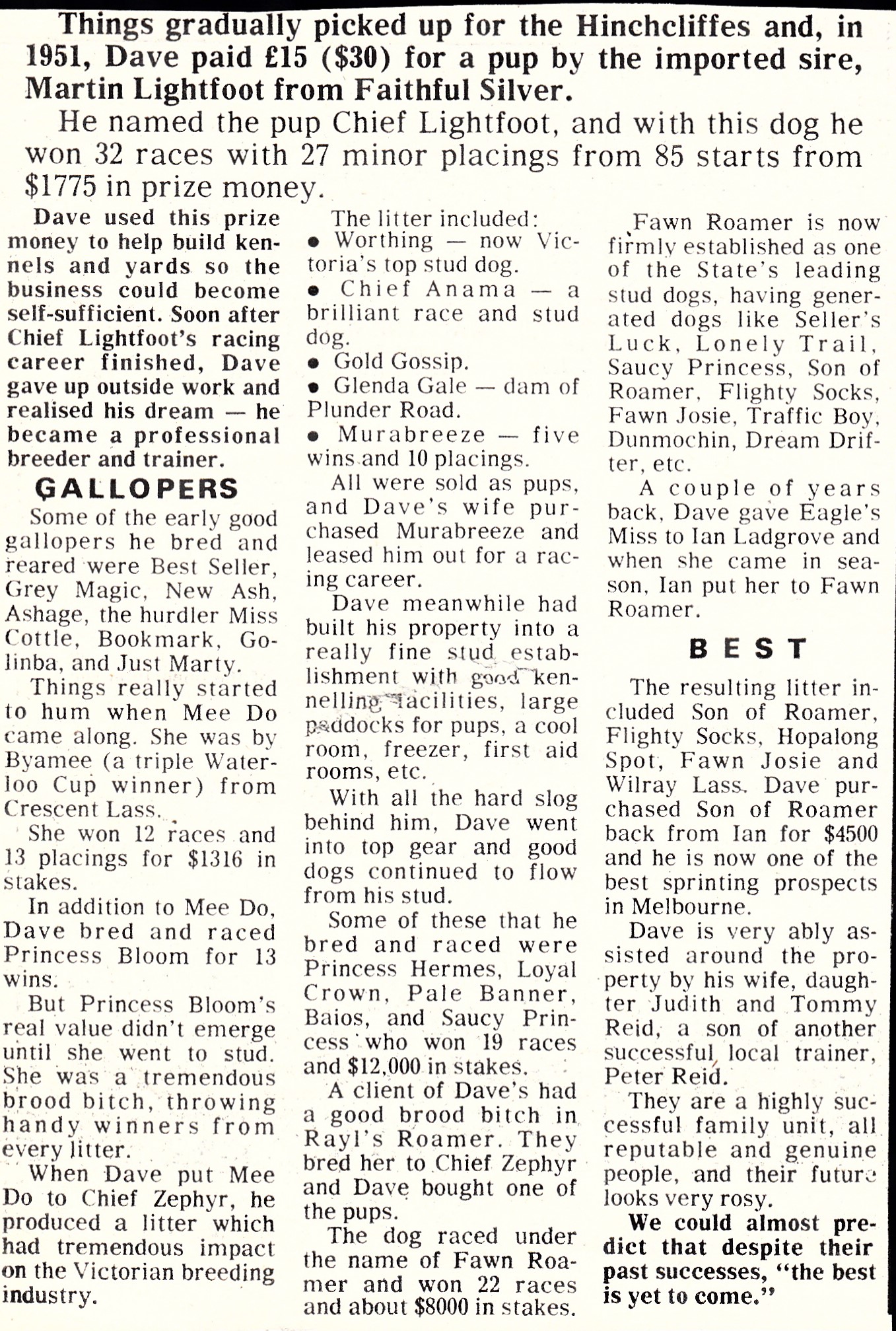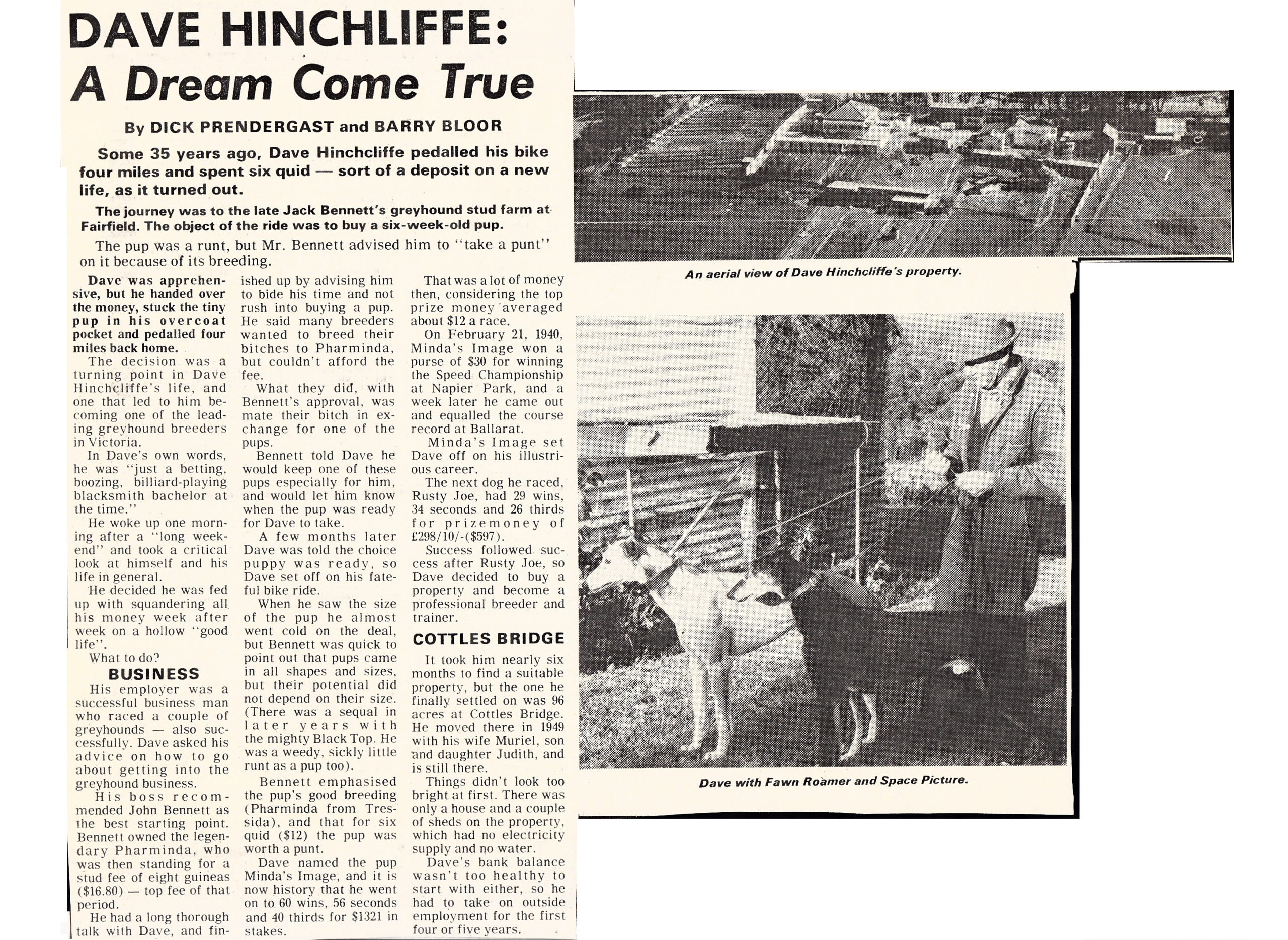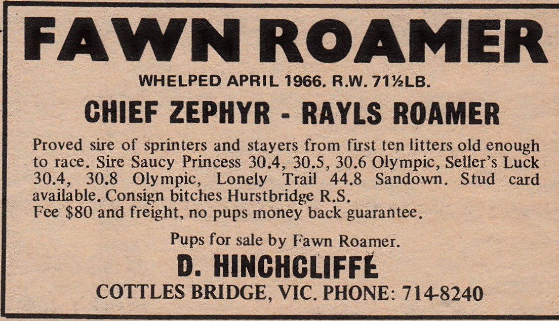Here’s a story done in 1973 about highly respected Victorian greyhound breeder Dave Hinchliffe. He started in the 1940’s and had a famous property at Cottles Bridge. Standing the very successful sire Fawn Roamer.
