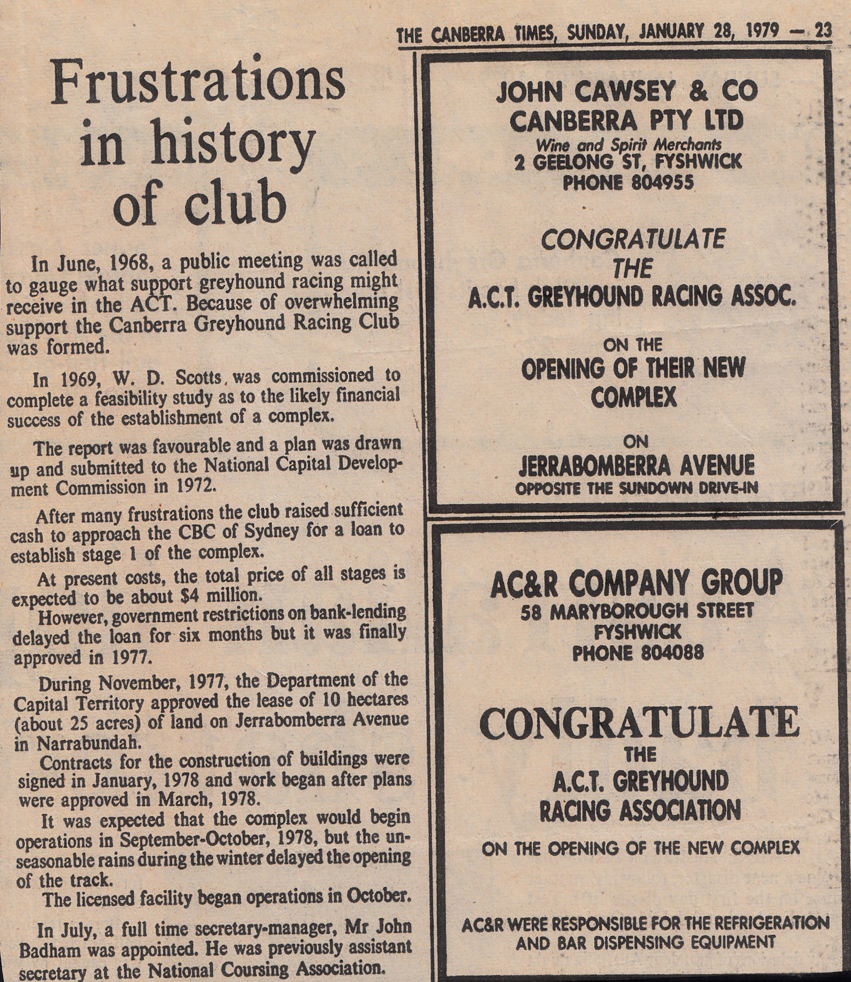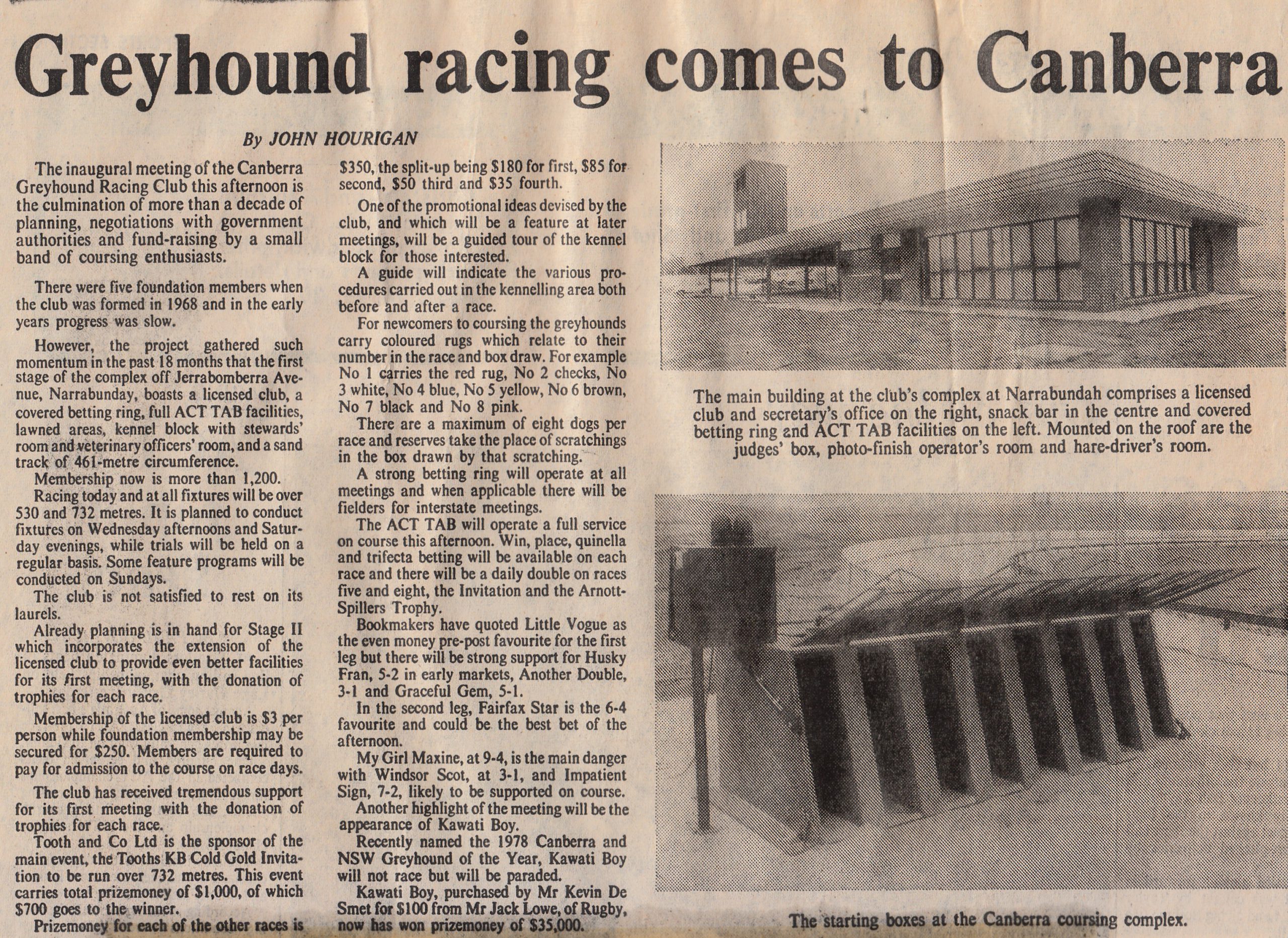 It was disappointing to watch the demise of the Canberra Greyhound Racing Club. Particularly at the hands of a minor Government body looking after a population of 472,000. What a joke in 1950 when it became Canberra only 20,000 lived there. Here is a Newspaper article from the Canberra Times Sunday January 28, 1979. It was opening night and some nice history on the Club. Also some great shots of the track taken by amateur photographer Nicole Moore who captured the old complex bueatifully.