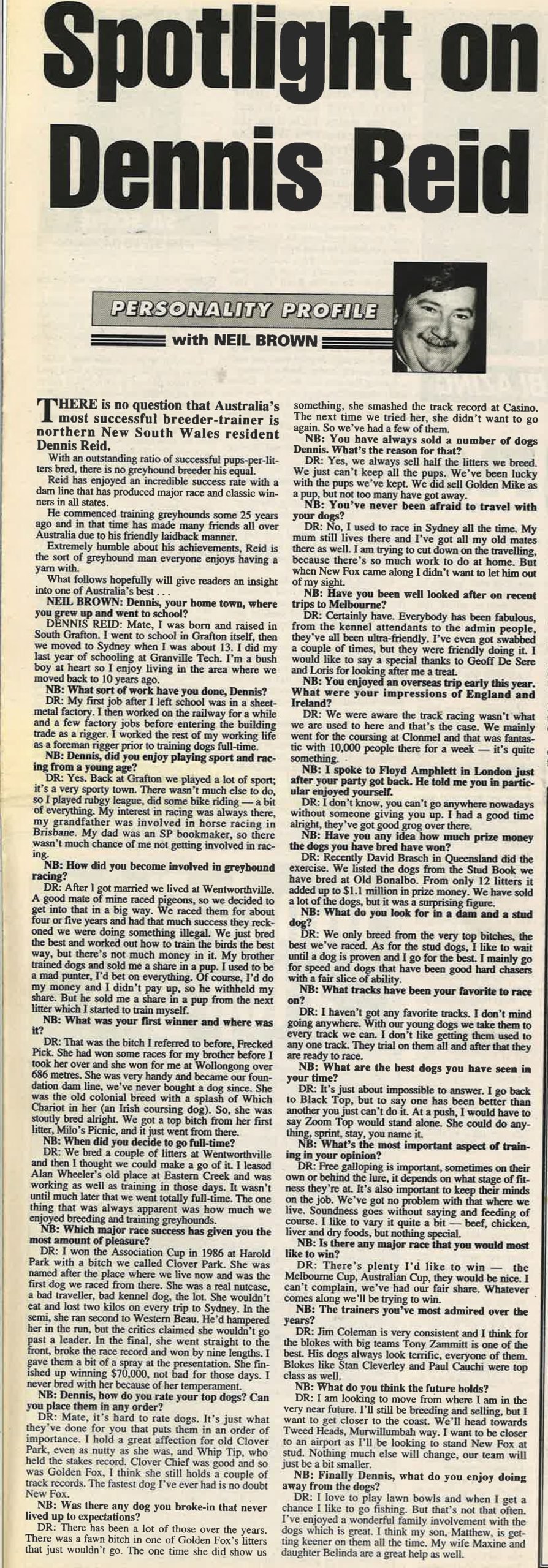I have been lucky to meet some fantastic people over years. One of them is champion trainer Dennis Reid. Quite a character he has bred and raced some of the best dogs this country has ever seen. Here is a Q and A I did with him back in the late 90’s.