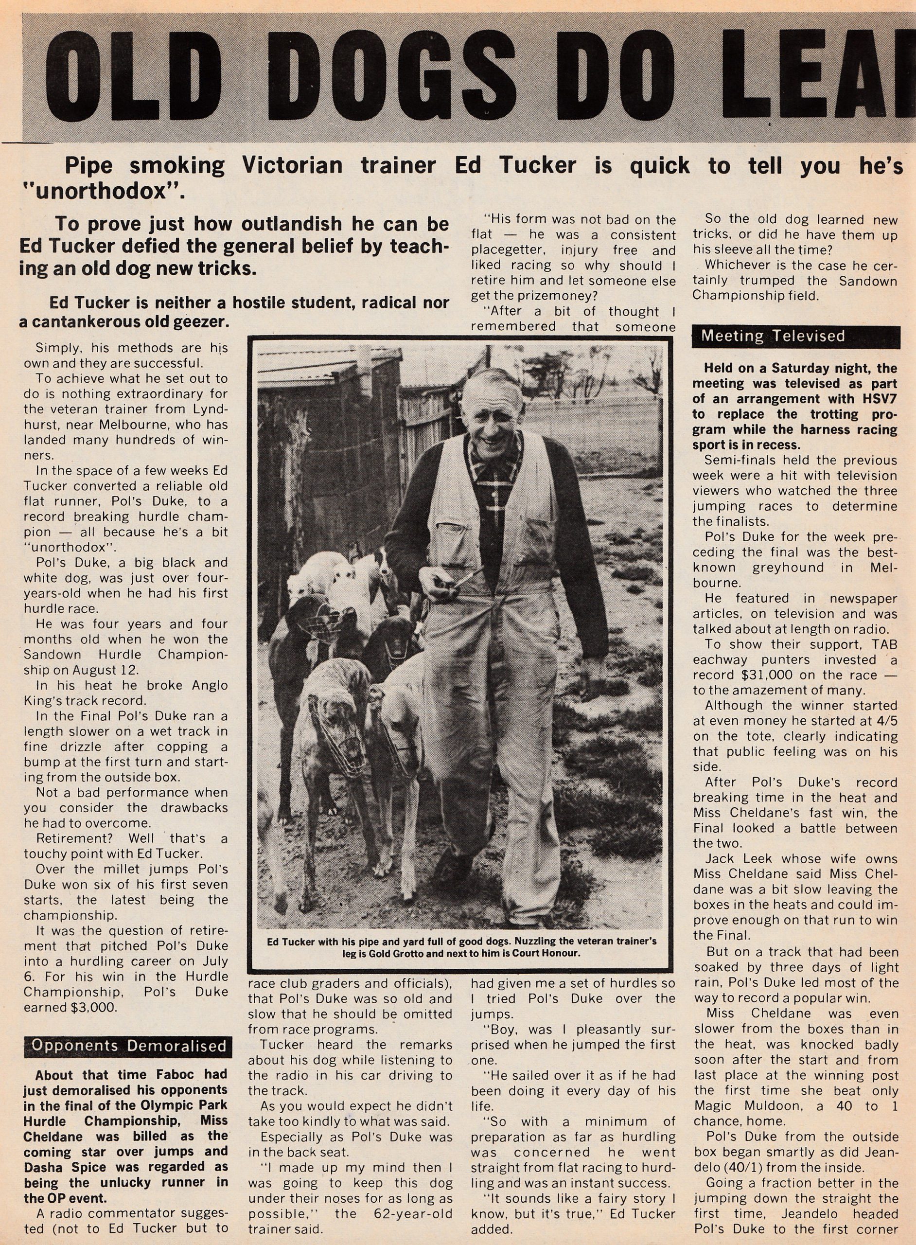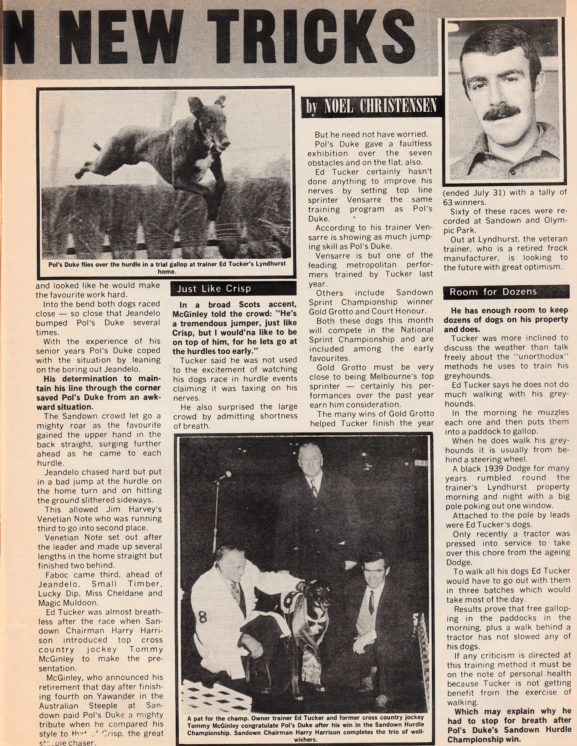 Peter Griffen asked me to find a story about the “Unorthodox” training methods of the late Ed Tucker. Ed trained one of favourite Sandown dogs the 1972 Melbourne Cup winner Gold Grotto. Gold Grotto use to own Sandown Park. Grotto wasn’t his first Melbourne Cup winner as he had put the polish on the last Cup winner when the race was held at Napier Park up the 400 yard straight. A young pup named Wanalta Chief in 1954. The race was worth 825 pounds Wanalta Chief was 19 months old, a 10/1 chance and he started of 12 yards. Winning by a head from Murray Bay in 20 9/16ths. According to reports he ran all over the track causing massive interference in an amazing display of erratic speed. Here is Noel Christensen’s story from 1972. Plus a photo of another outstanding sprinter Ed trained Court Honour.