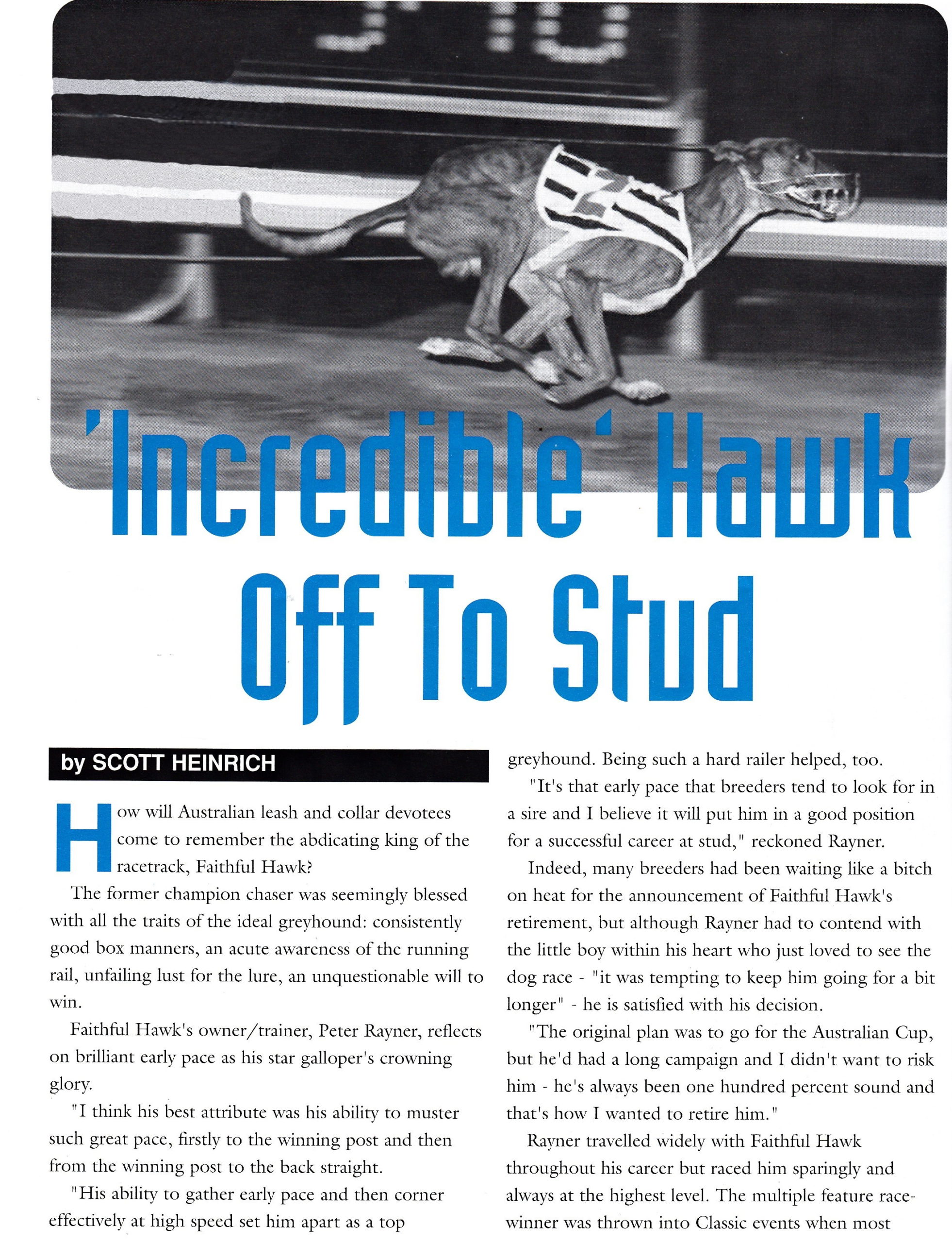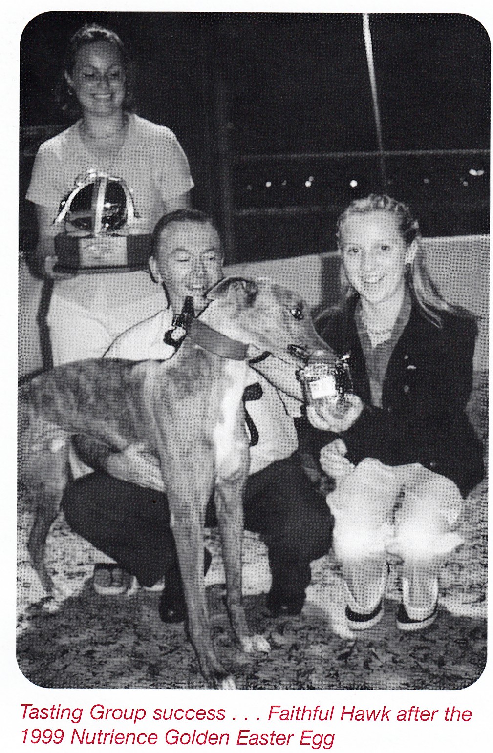 Another star Queenslander Faithful Hawk 1999 Easter Egg winner. 50 starts for 25 wins and 18 placings $260,000 in stakes. Successful sire 229 litters for 726 offspring. Best perhaps Lindale Blue, Toss O’Reilly, Marlon Banner, Oxley Tiger and Jewelled Miss to name a few.