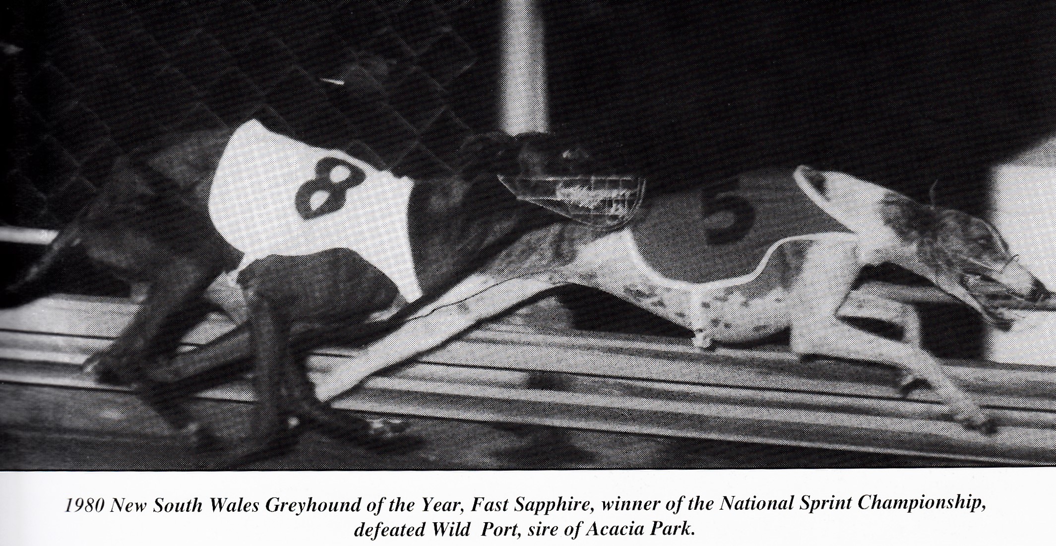 Fast Sapphire NSW Greyhound of the Year 1980. By Benjamin John from Sapphire Flash. Bred by Alf Standen and brought by Dapto hotelier Jack Duggan for $1500 as a 10-month-old pup on the recommendation of Ernie Rowe who later trained him. 97 starts for 42 wins, 24 seconds, 17 thirds. 14 unplaced runs he won $65,000 in prizemoney. Fast Sapphire contested 13 major finals for three wins two second and three thirds. Winner of the 1980 National Sprint Championship at Harold Park.