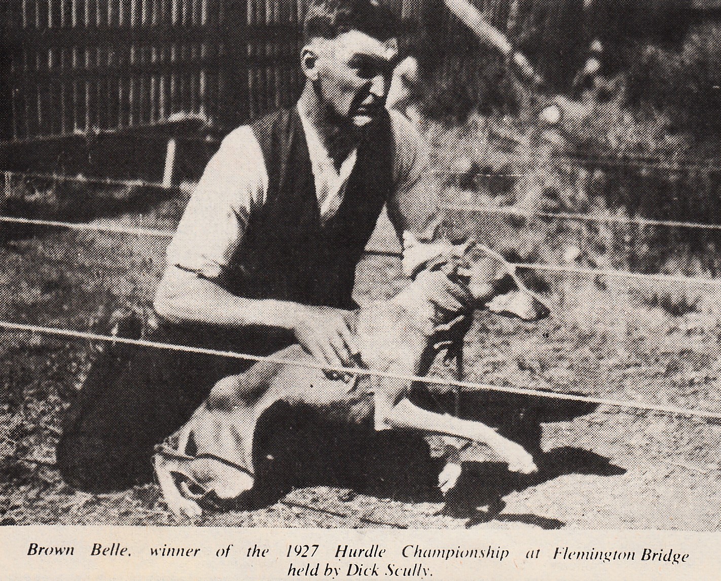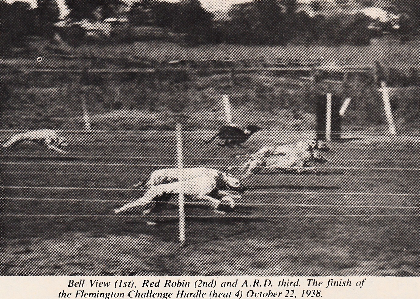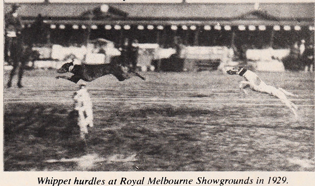 Flemington Bridge Whippet Hurdle racing in 1927. On the site of the Flemington Markets it started in 1923 and was conducted by the Victorian Whippet Racing Club. Races were held over 120 yards. Lenore Frost a historical author from the area sent me a document showing the MMBW plan showing where the Gurney’s Running Ground was for the Whippet racing.  There were also races held at the Royal Melbourne Showgrounds back in 1929.