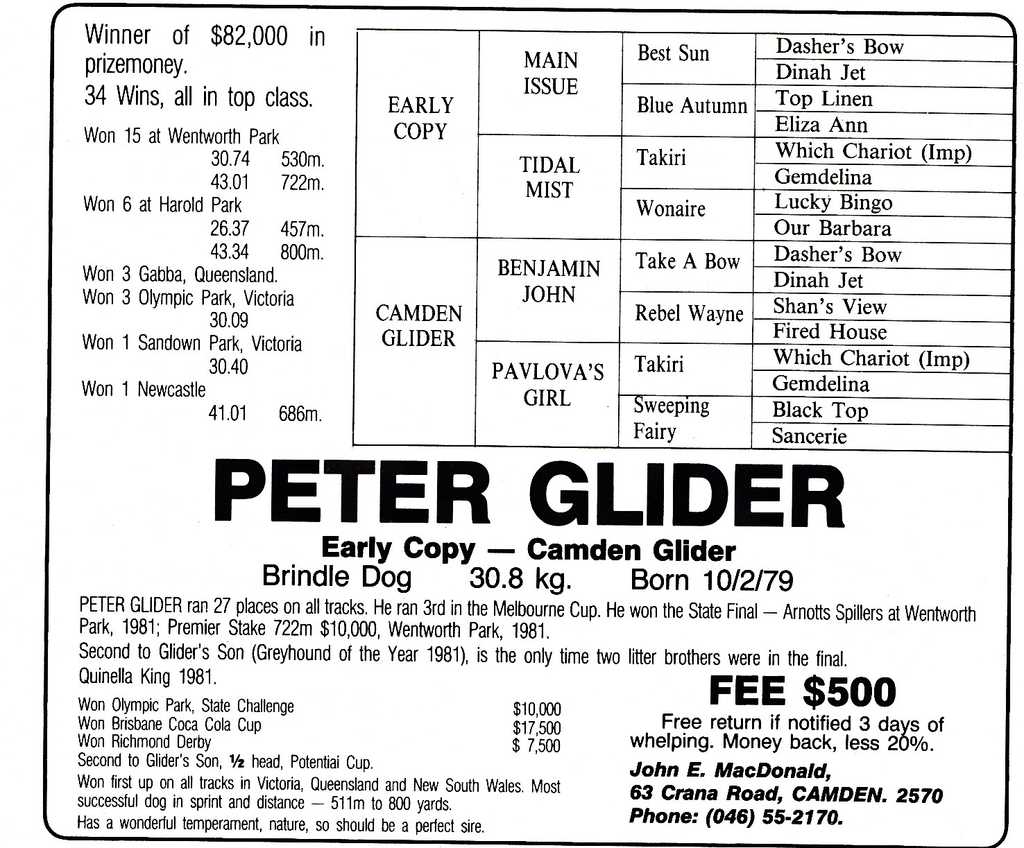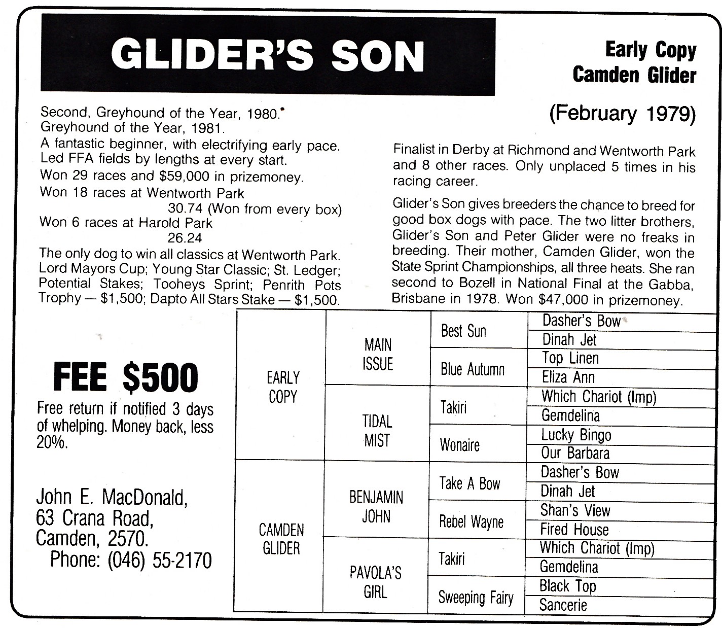 Glider’s Son and Peter Glider bred, reared, owned and trained by John McDonald of Camden. Early Copy from Camden Glider both outstanding chasers. What about the class of the field Peter Glider beat in the Interstate challenge. Good to see a pic of the “Buzz” for the Carlton fans.