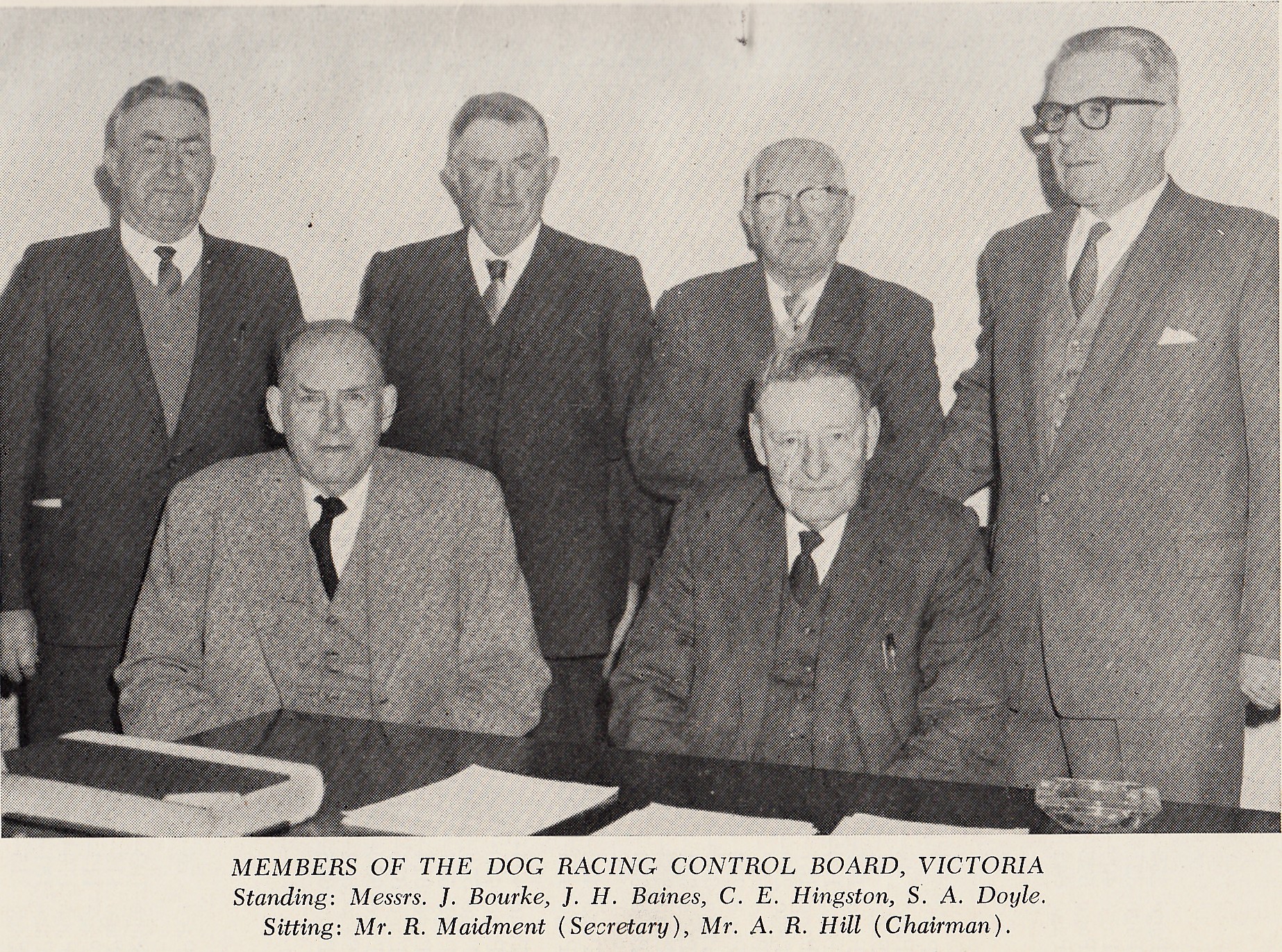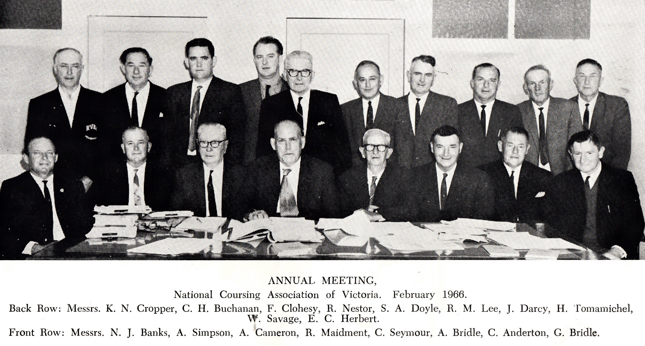 What a fantastic group of Greyhound men both coursing and racing. The Annual Meeting of the National Coursing Association of Victoria 1966. Their contribution as a collective is hard to measure. Three stand outs Noel Banks, Roy Maidment and Ron Nestor all are in the Victoria and GCA Hall of Fame. Plus, household names of the industry Buck Buchanan, Silvester Doyle (Victorian Hall of Fame), Rupert Lee, Horrie Tomamichel, Eric Herbert, Andy Simpson, Frank Clohesy and Charlie Anderton. Some were still at in 73-74 on the GRCB. Earlier in 1960-61 on the GRCB.