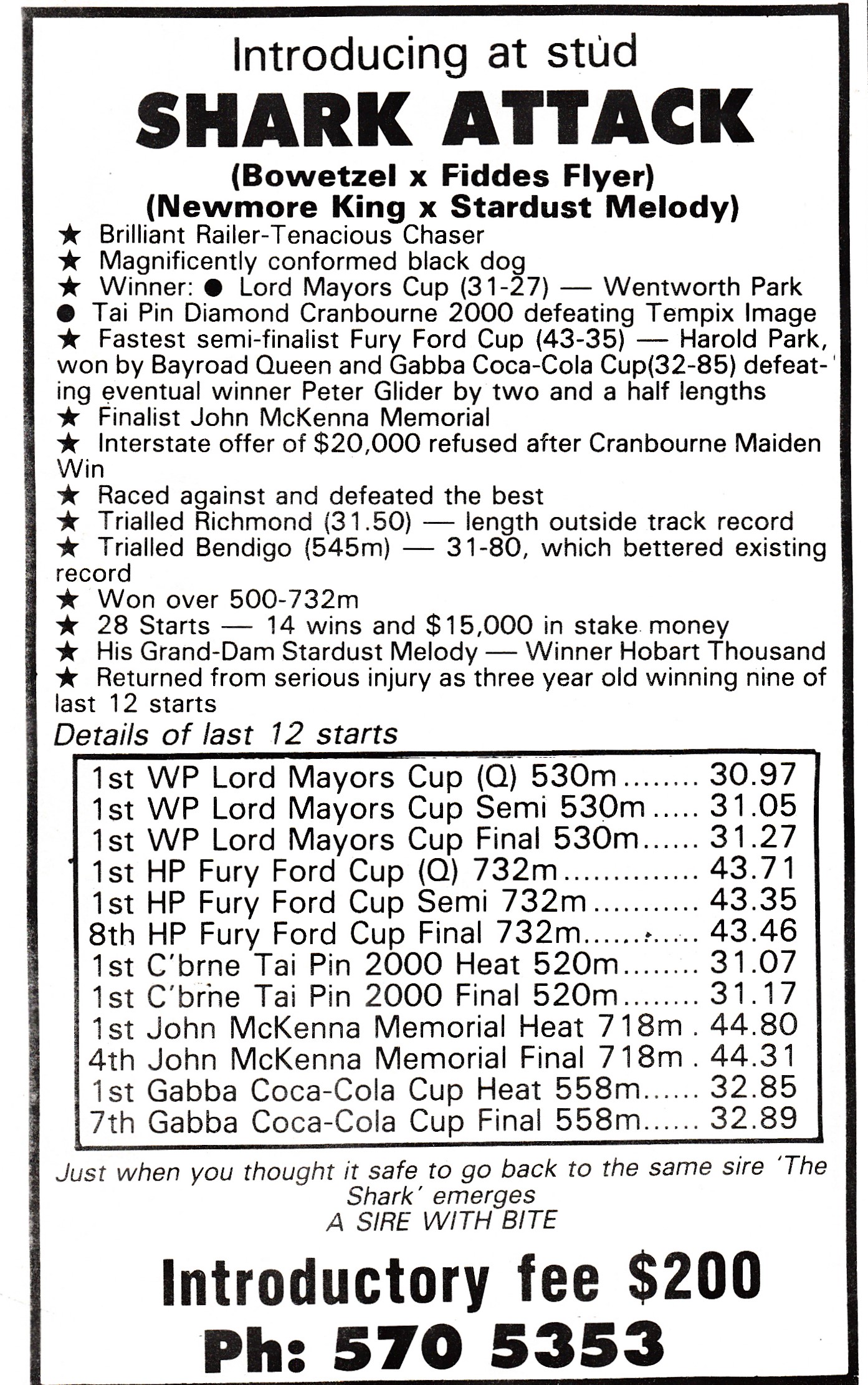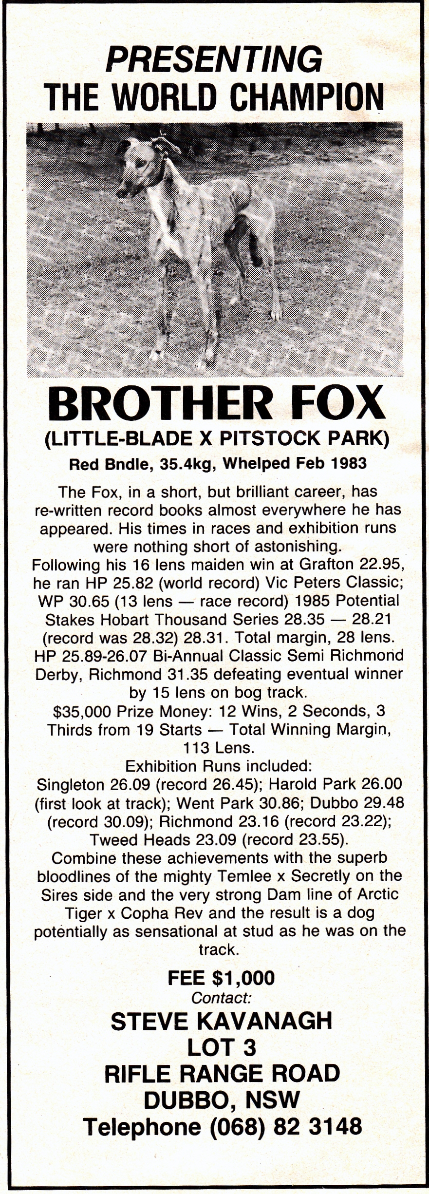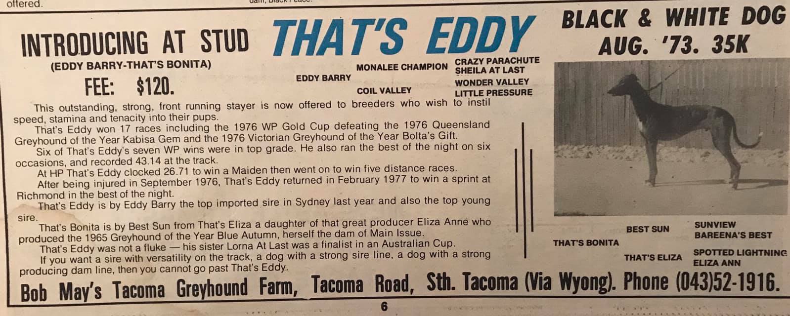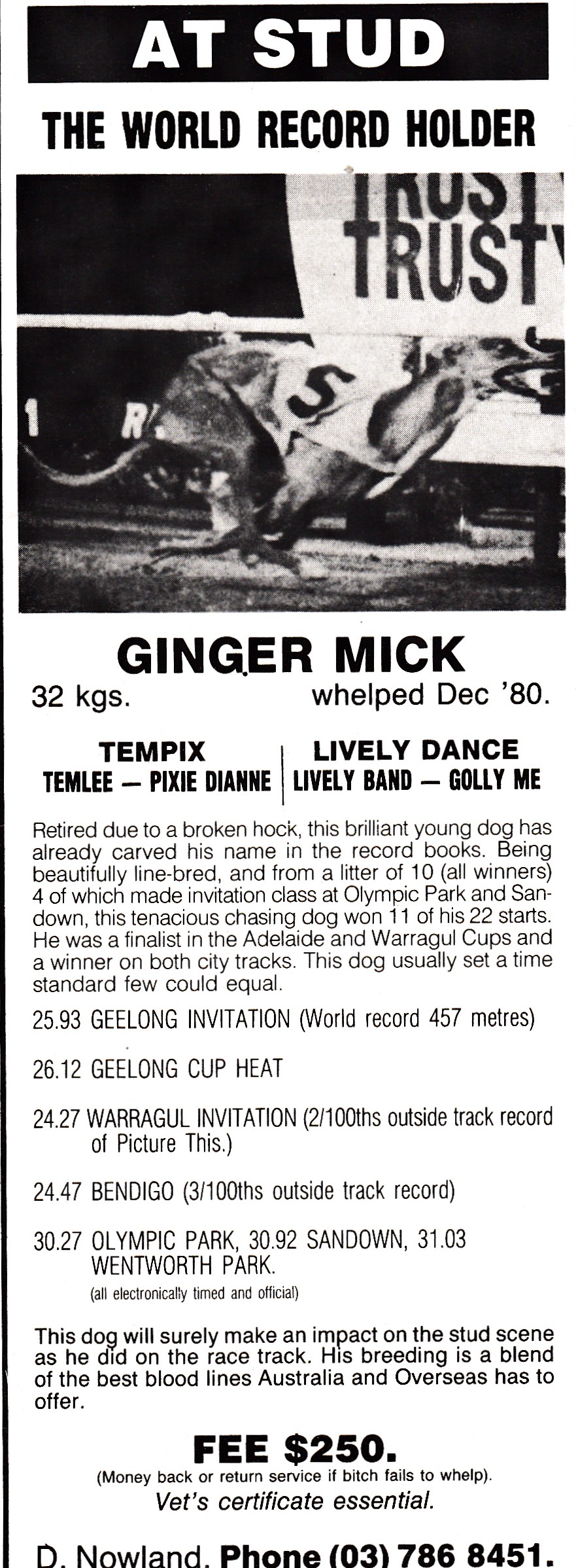 Here is some Stud ad’s I have found remembering a number of terrific performers and listing the highlights of their careers. Some great dogs.