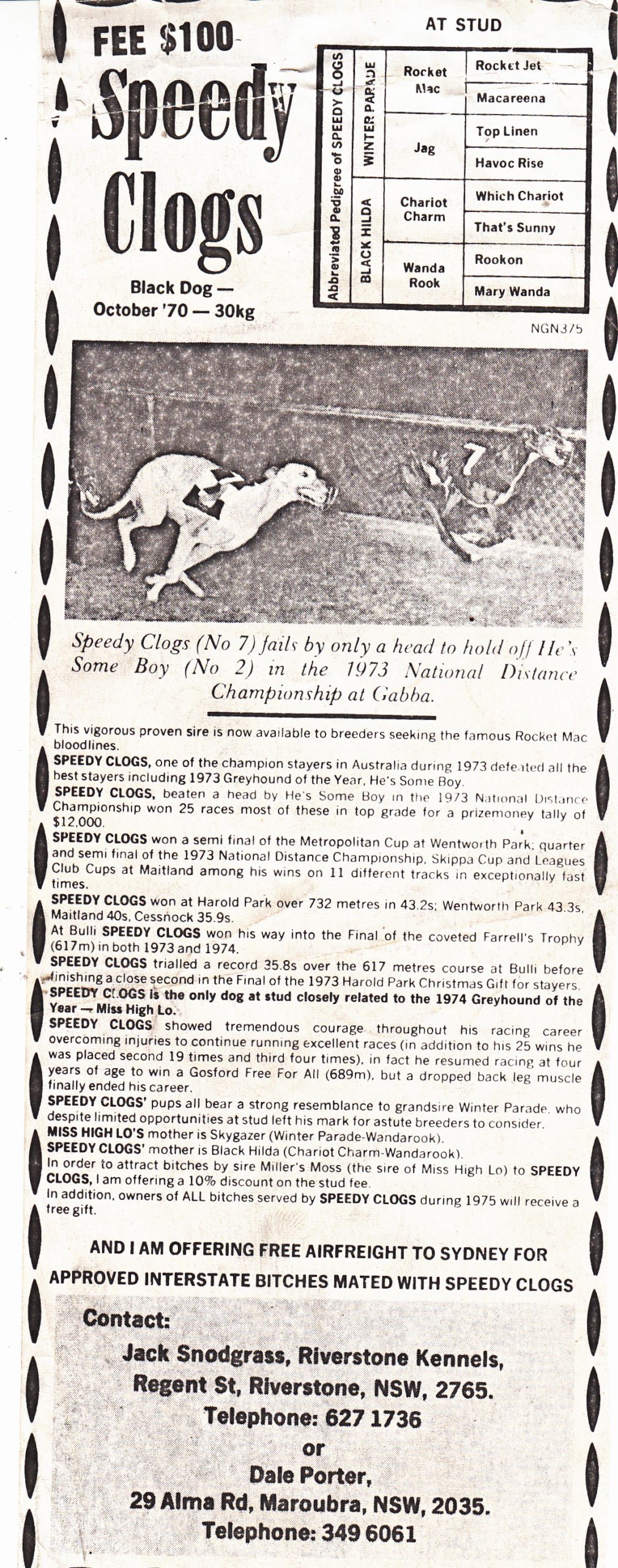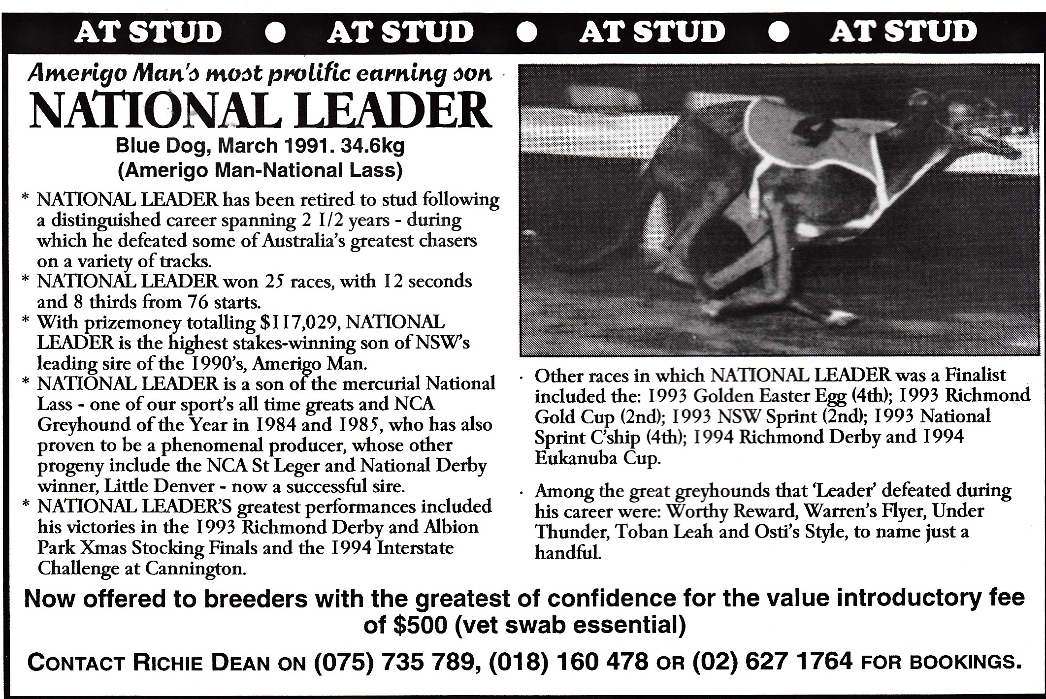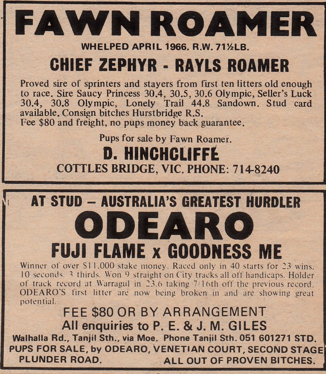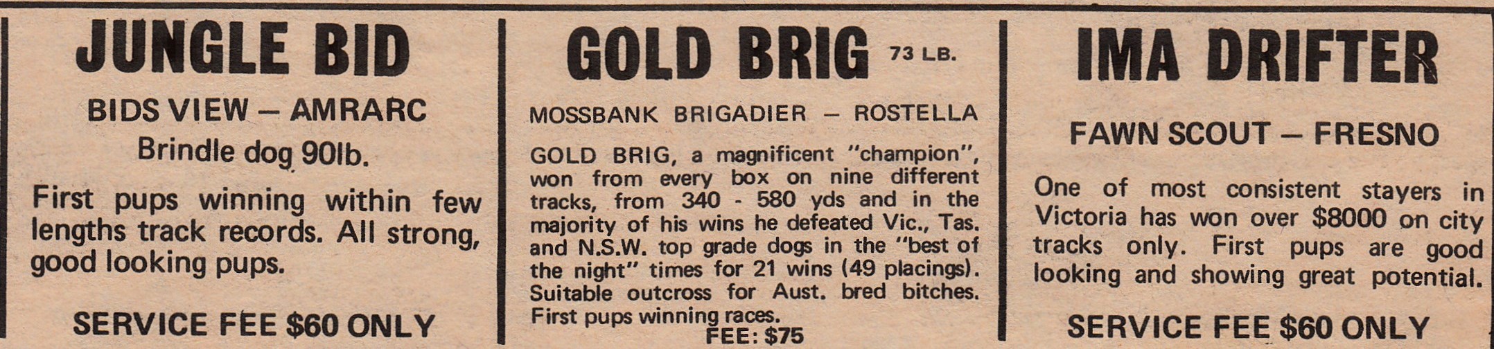 Here is some Stud ad’s I have found remembering a number of terrific performers and listing the highlights of their careers. Some great dogs.