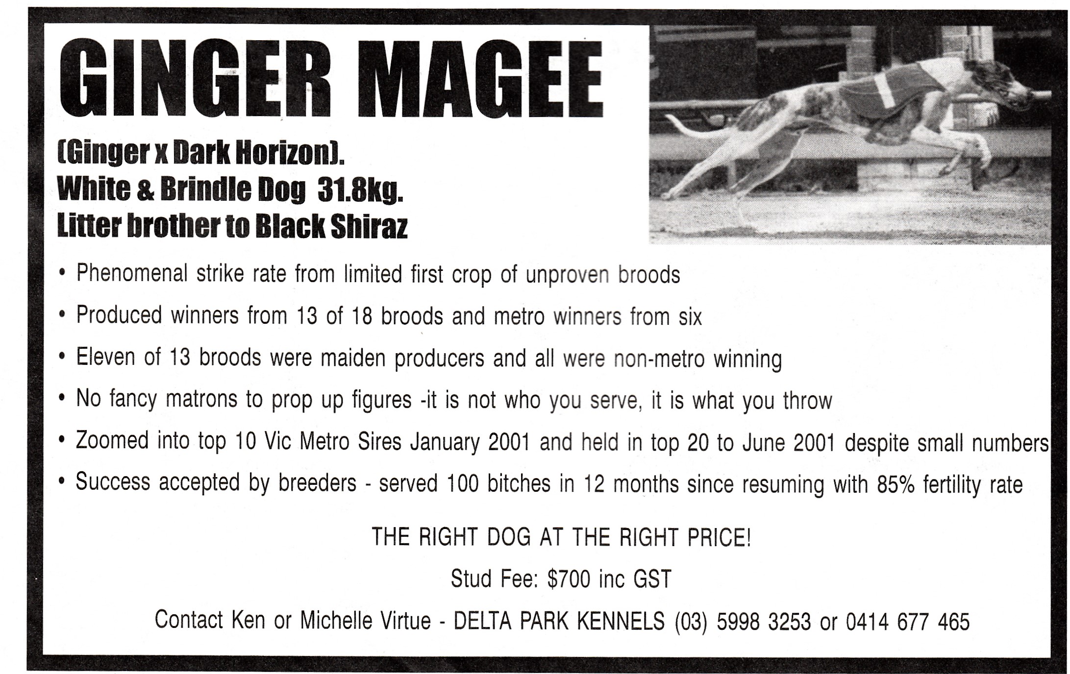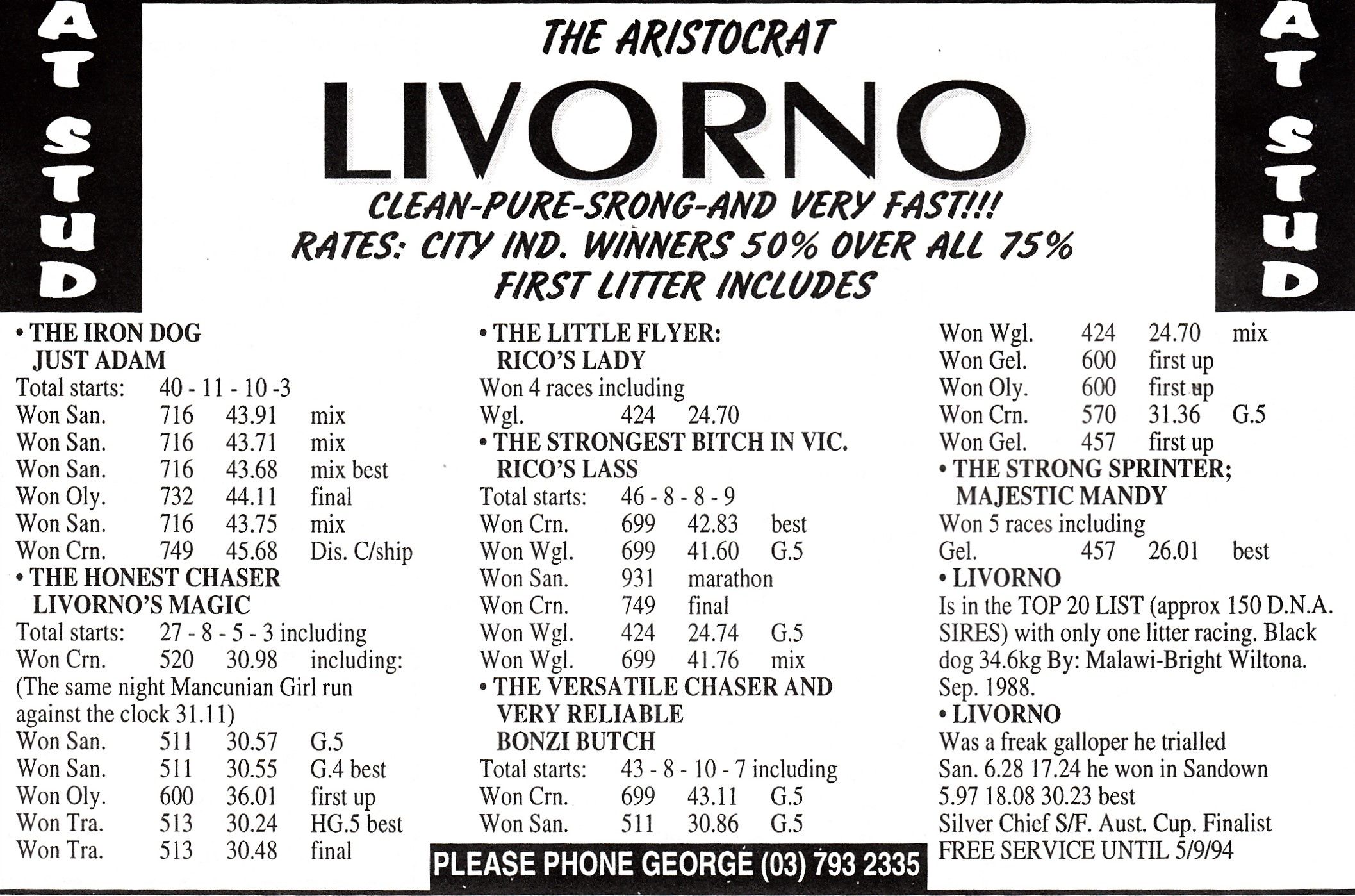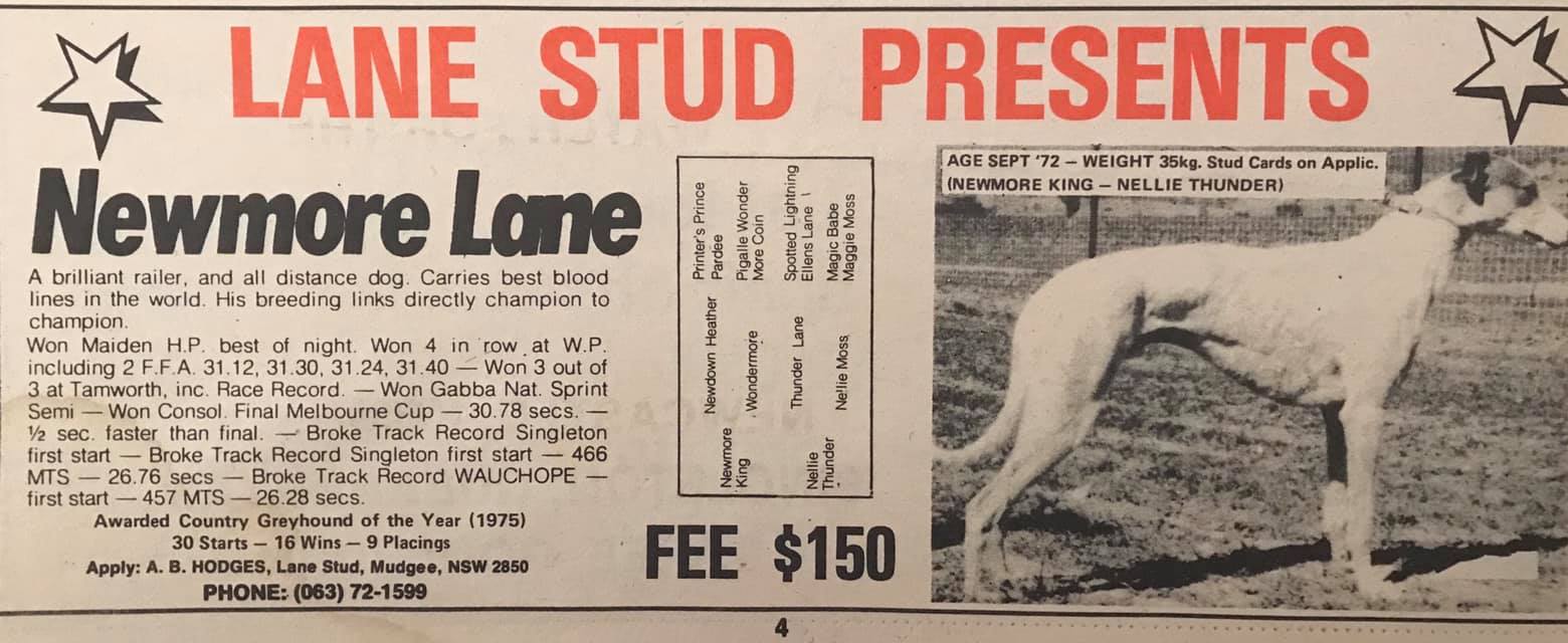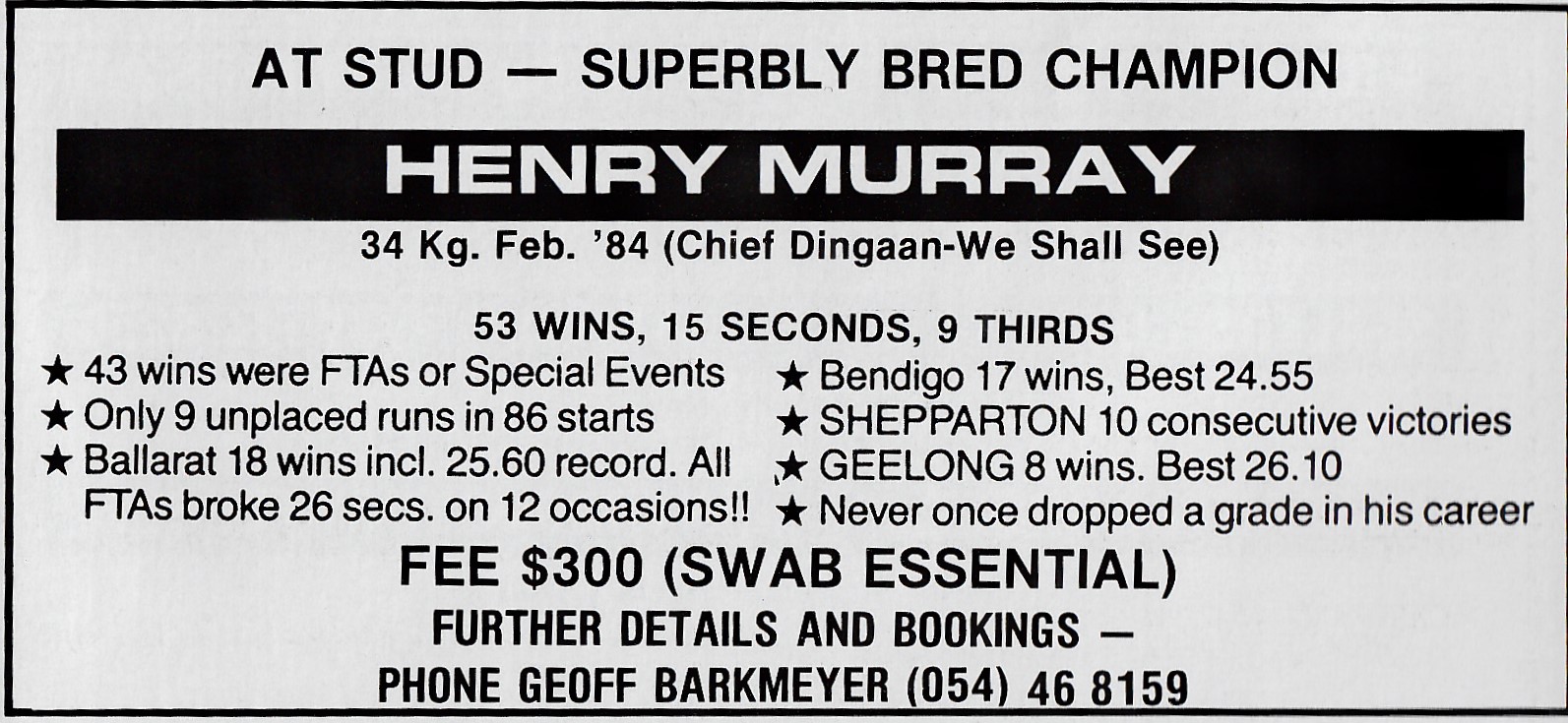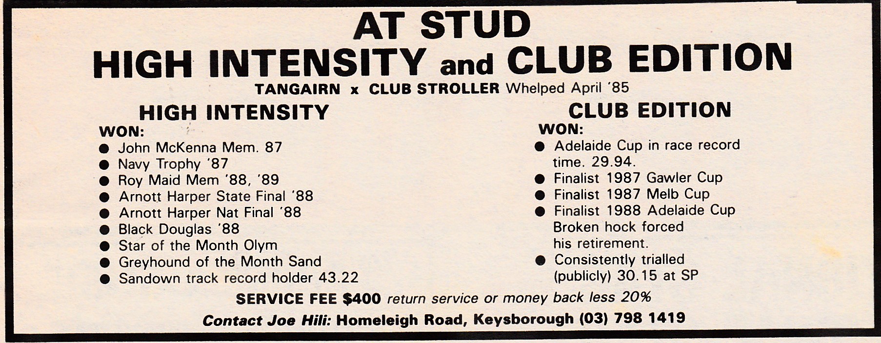 Here is some Stud ad’s I have found remembering a number of terrific performers and listing the highlights of their careers. Some great dogs.