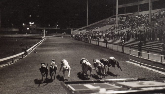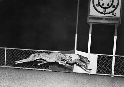 Great shot from behind the boxes at Wenty. A race finish shot at Wentworth Park taken in 1949 dogs unknown.