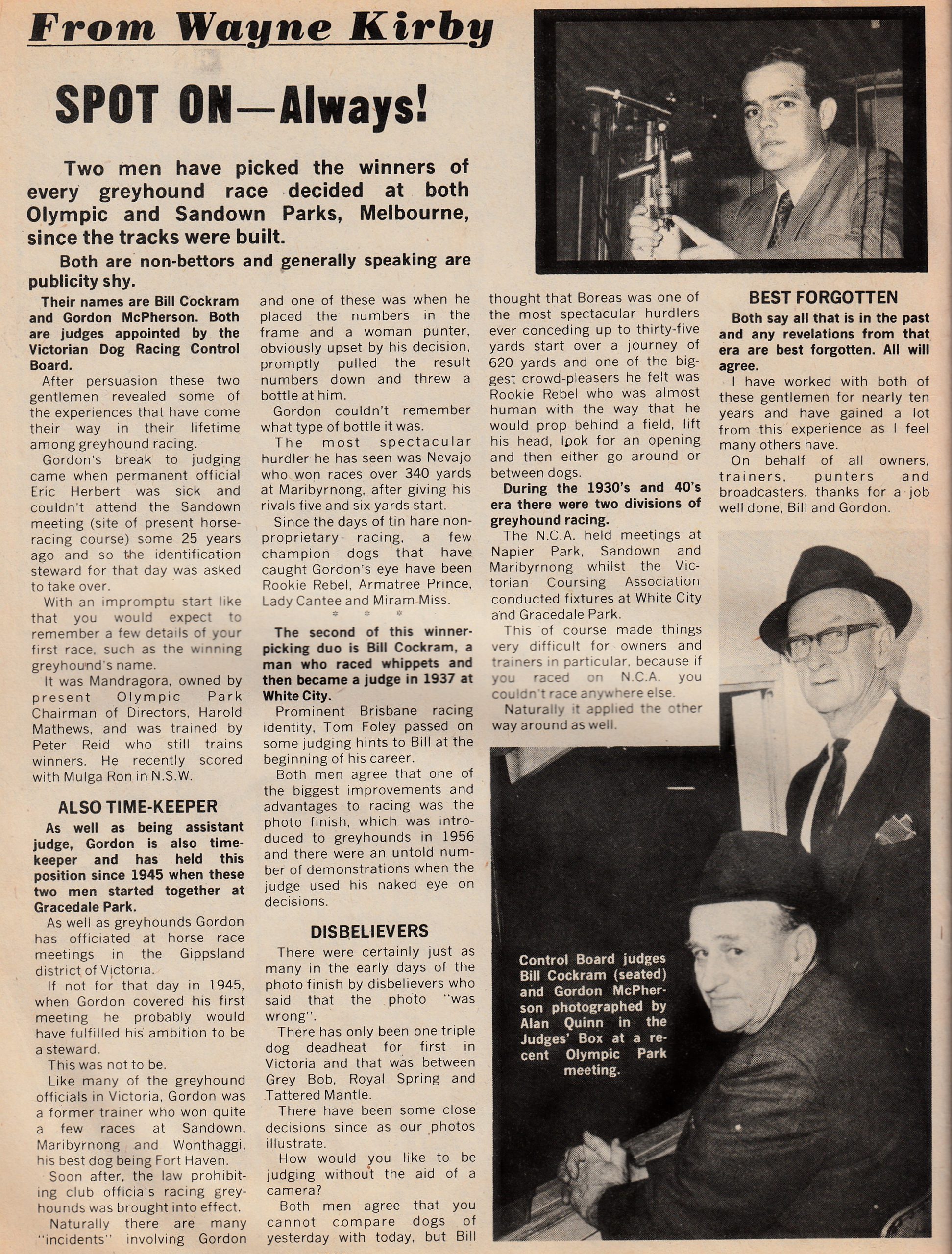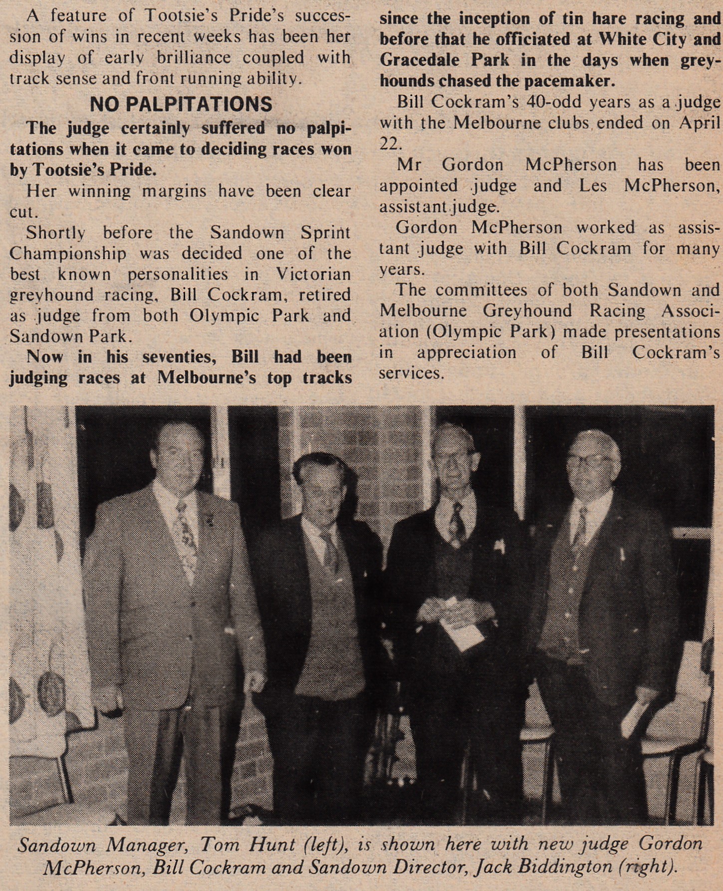 Here is Bill Cockram’s retirement as Judge after 40 years. His replacement is my uncle Gordon McPherson who also judged for a long time and handed it down to my cousin Les named after my Grandfather. They saw a few dog races in their time those boys. A couple of other top Sandown men in the photo Tom Hunt and Jack Biddington.