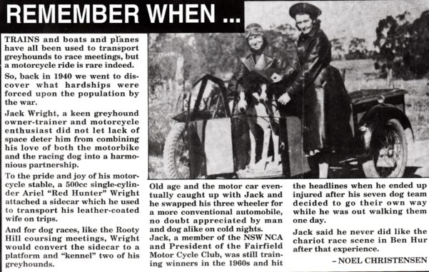 Jeff Collerson – Jack Wright who lived at Guildford if he had 1 runner only would put the dog in his sidecar and go by motor bike to tracks like Wollongong. He was a top trainer too he won the 1959 Paws Of Thunder then called the NSW St Leger) with Super Samson.