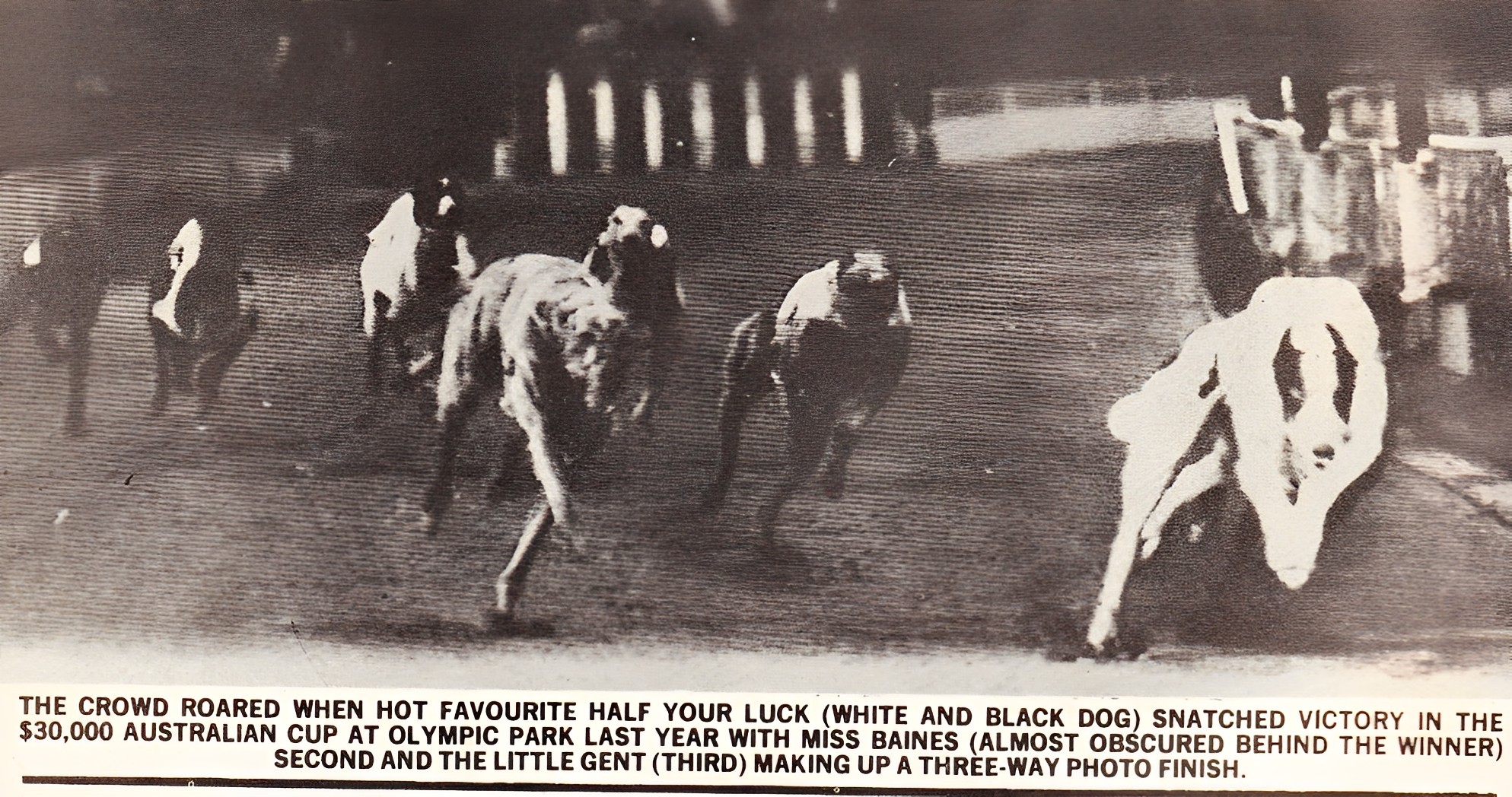 Great action shot of Half Your Luck. He won his maiden at the old Eaglehawk track in Bendigo on a Saturday night. That was after coursing three times that afternoon at Tatura.
