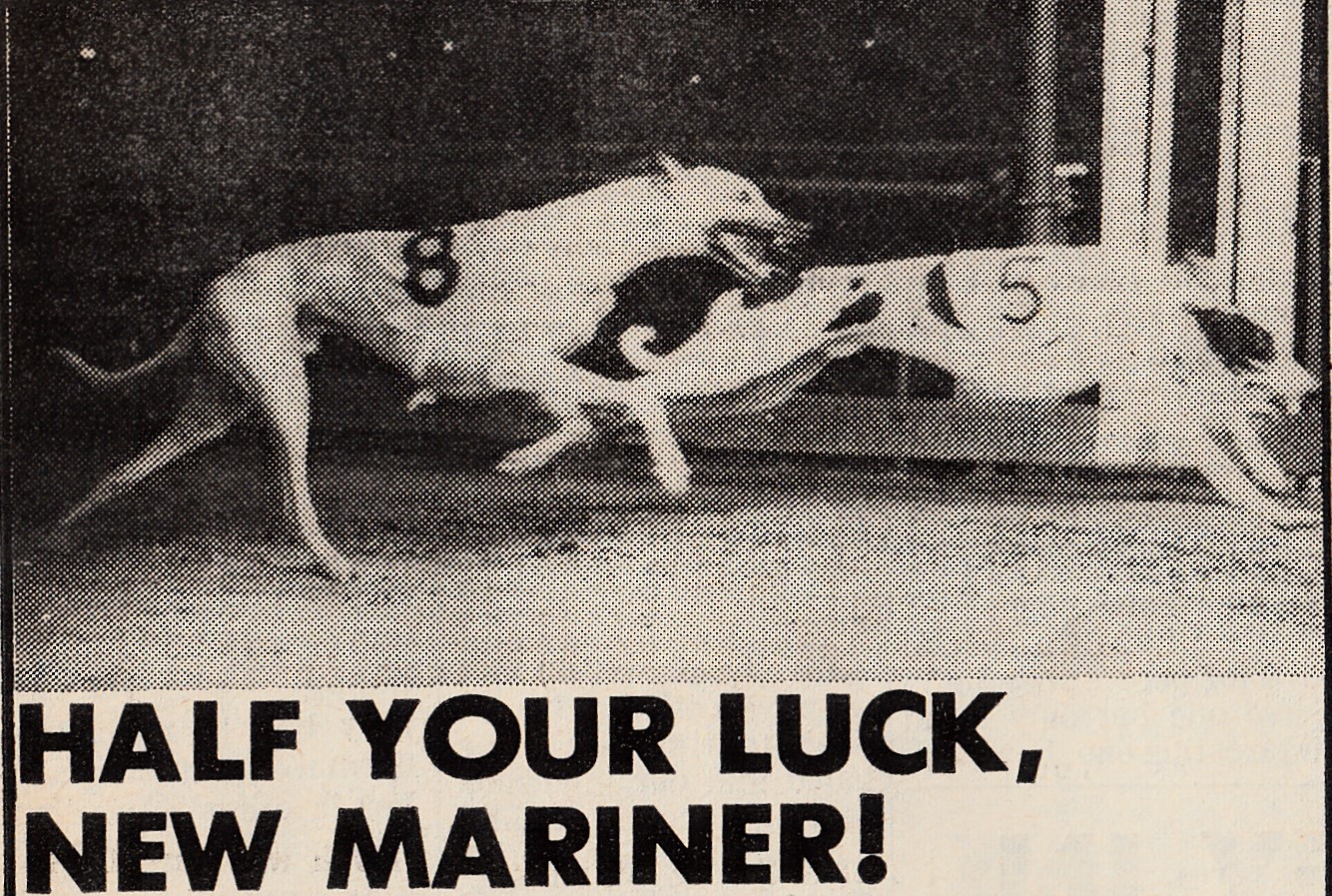 New Mariner drew the coveted rails while Half Your Luck wore the pink. Heavy rain made the track a bog and at box rise it looked as though Half Your Luck was again going to down his rival. The white and black sprinter began well and was close to the lead going into the first turn. New Mariner had stepped slowly but then drove hard along the rails into the first bend. Using all his 37-kilos to advantage, New Mariner shouldered his rivals out of the way and railed to an unbeatable lead. He went on to score by seven lengths from Half Your Luck in a slow 31.49.