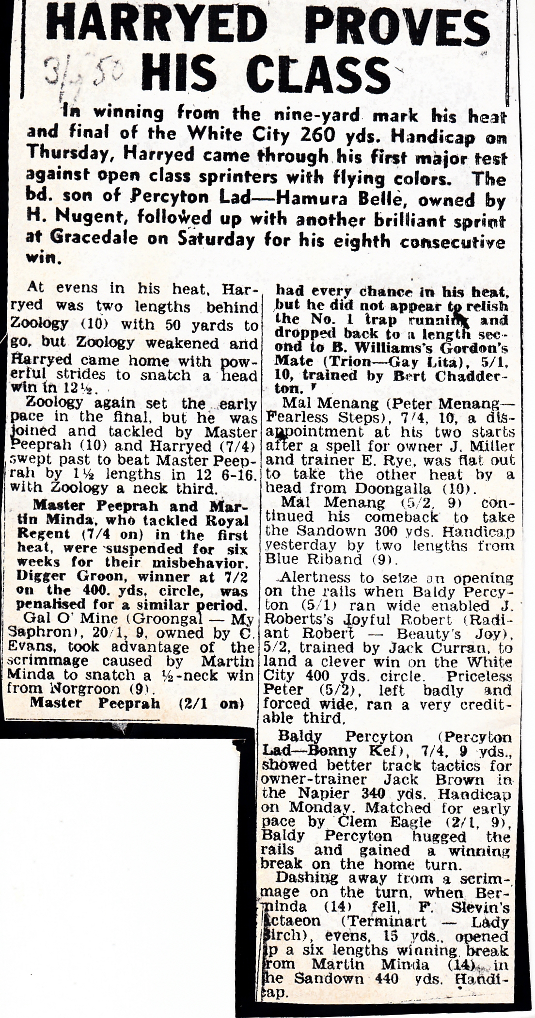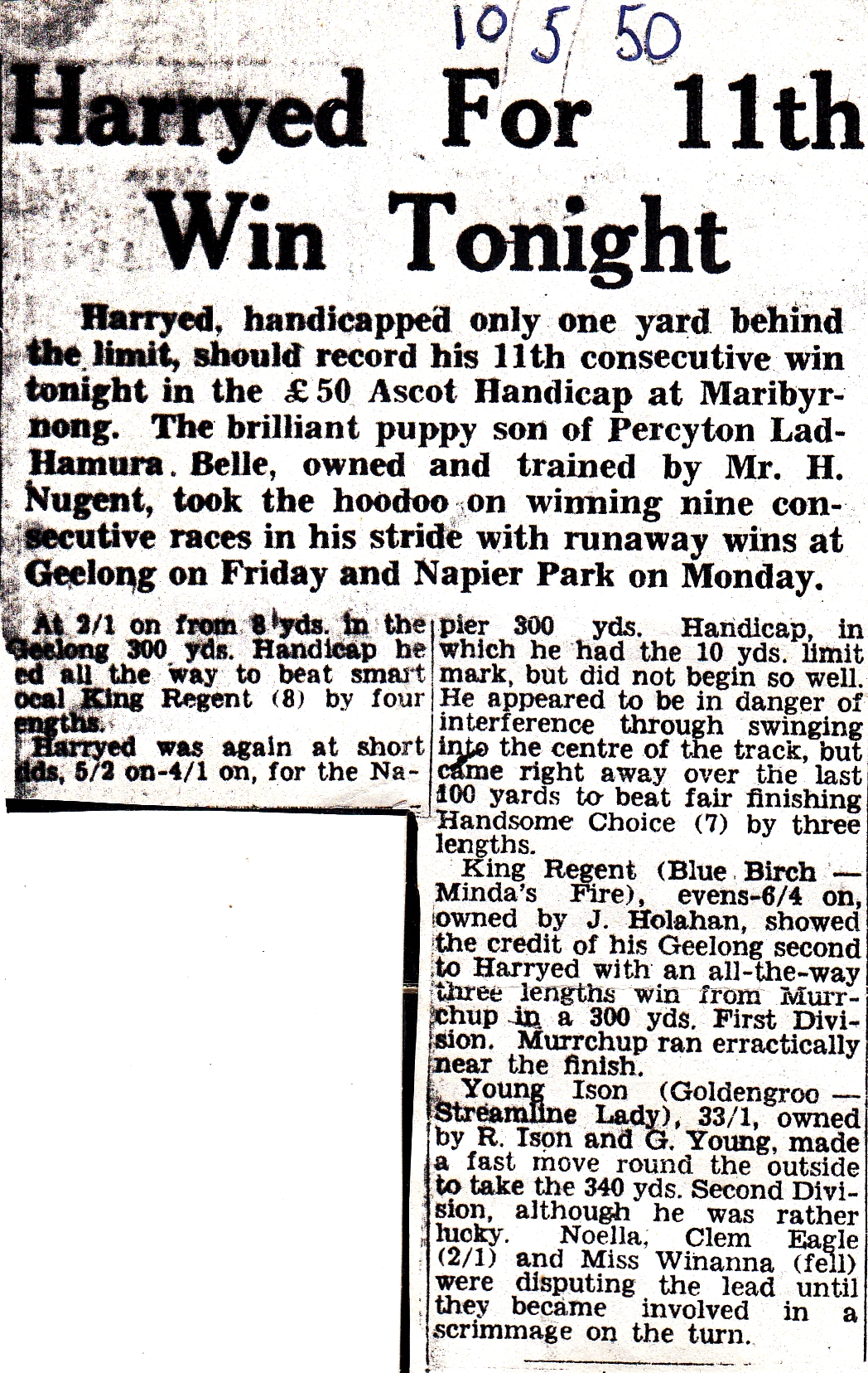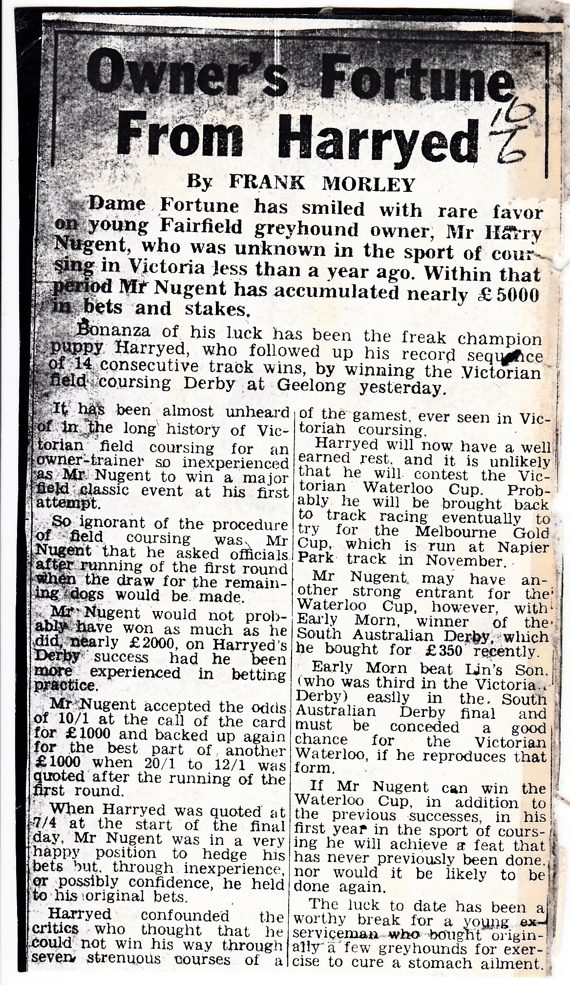 A series of Sporting Globe stories about the mighty Harryed and newcomer to the training ranks Harry Nugent a 36-year-old ex-serviceman and former racing cyclist from Fairfield.