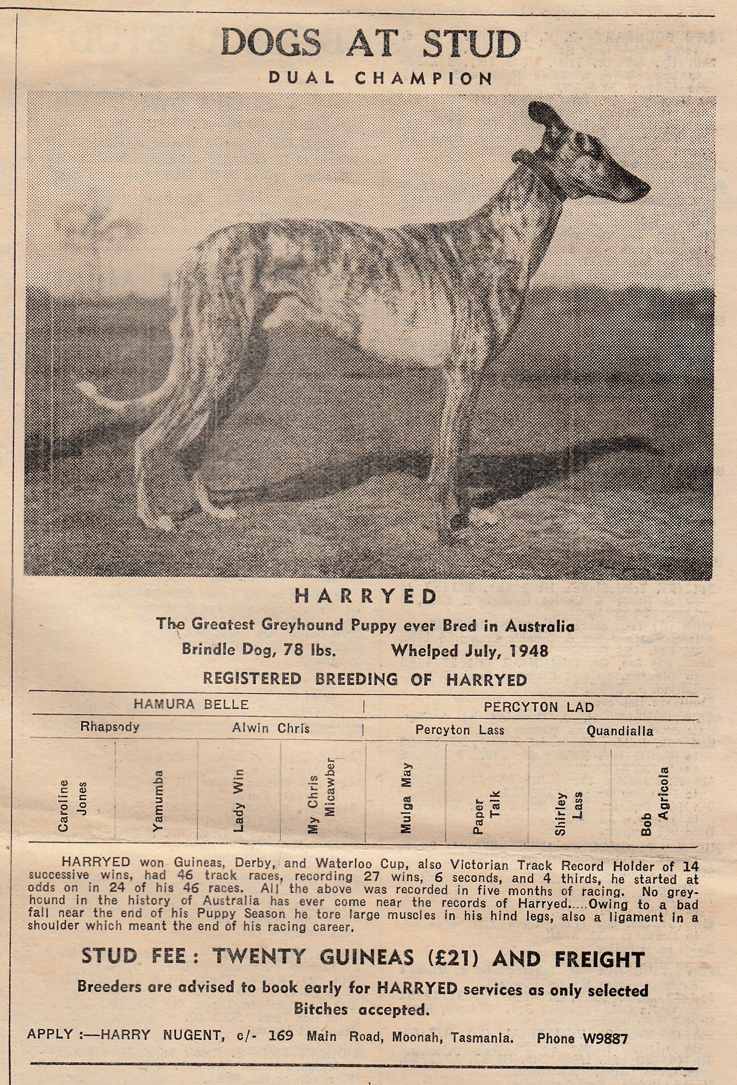 The great Harryed (Percyton x Hamura Belle) Whelped July 1948 he was bred and raced by former MGRA Director Harry Rose and trained by legendary Victorian trainer Harry Nugent. It is thought that Harry held a trainer’s license longer than any other person in Victoria. Not only was Harryed a champion coursing dog winning both the 1950’s classics but he also held the record for the most consecutive wins 14. That record started on July 14th, 1949, and finished on February 15th, 1950. I think broken by Kate’s A Scandal in the National Sprint of 1981, correct me if I am wrong.
