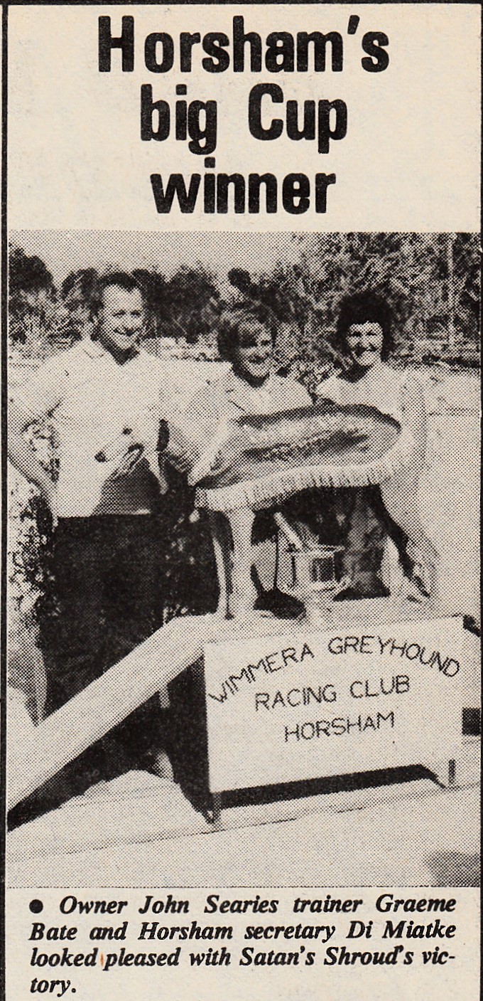 Graeme Bate loved combining his two passions Fishing and Greyhound Racing. One of his favourite’s Easter weekend at the Horsham Cup. Here he is with champion Satan’s Shroud after winning in 1981. He would camp on the banks of the Wimmera River at the back of the track and partake in the Fishing Competitions. He also won it with Propellant, Hay Dinney, Lansley Bale, Kantarn Bale, Timjim Bale and Velocette.