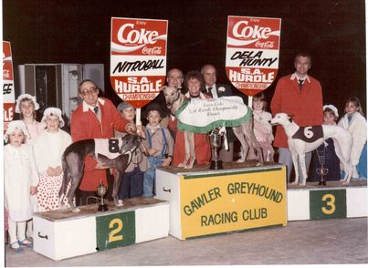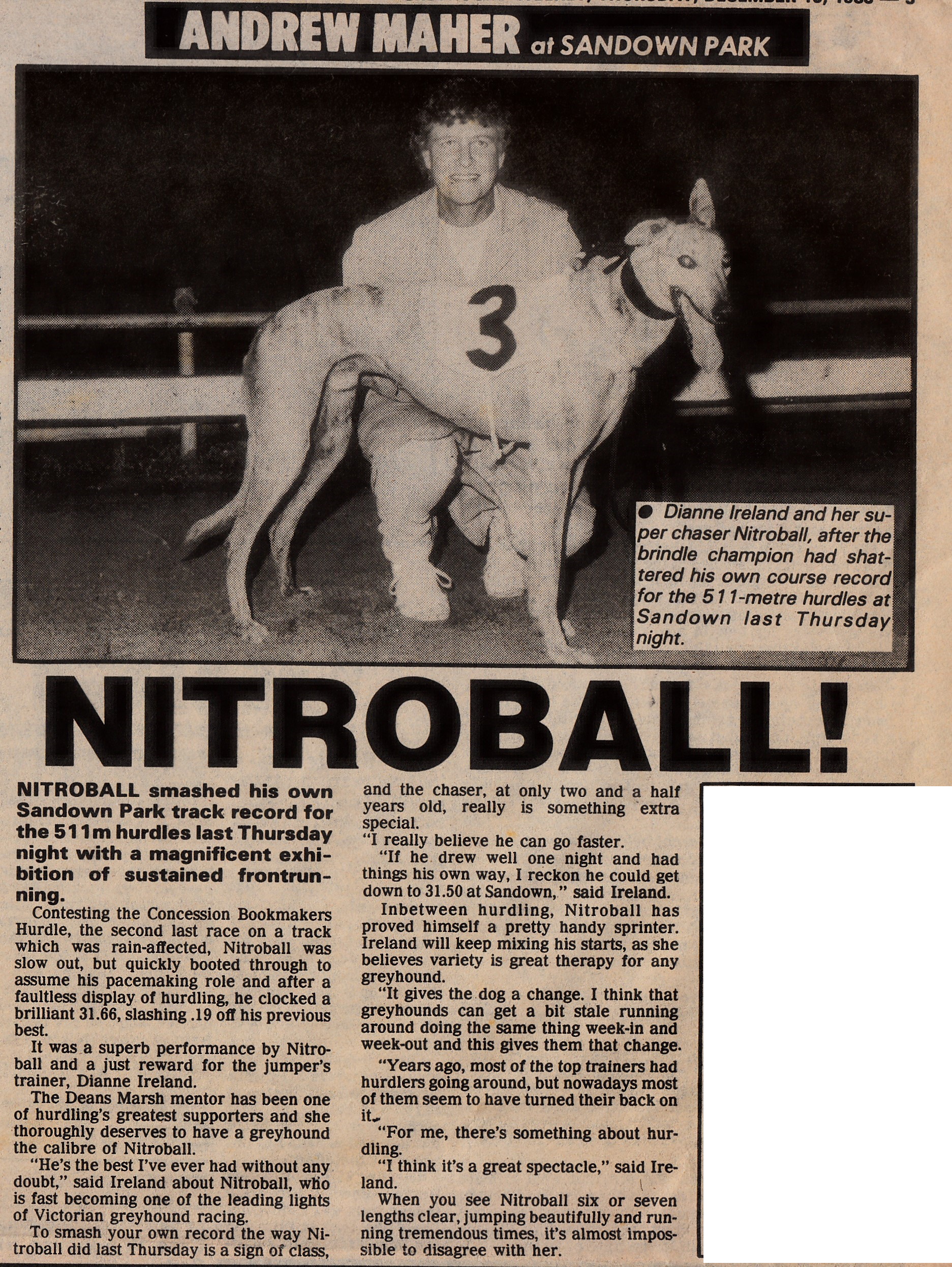 Another top hurdle of the late 80’s was Nitroball pictured below with trainer Dianne Ireland. A Brindle dog by Nitrogen from Ballalee he raced over both the jumps and on the flat from Feb 1988 until April 1990. He had 67 starts for 16 wins and 20 placings. Nitroball mainly raced at Sandown and Olympic Park but also won at Warrnambool and Gawler. He won the 1988 Olympic Park Hurdle Championship and twice broke the Track Record at Sandown. Notice the story is written by prominent football media personality Andy Maher who worked for the Greyhound Weekly in those days.