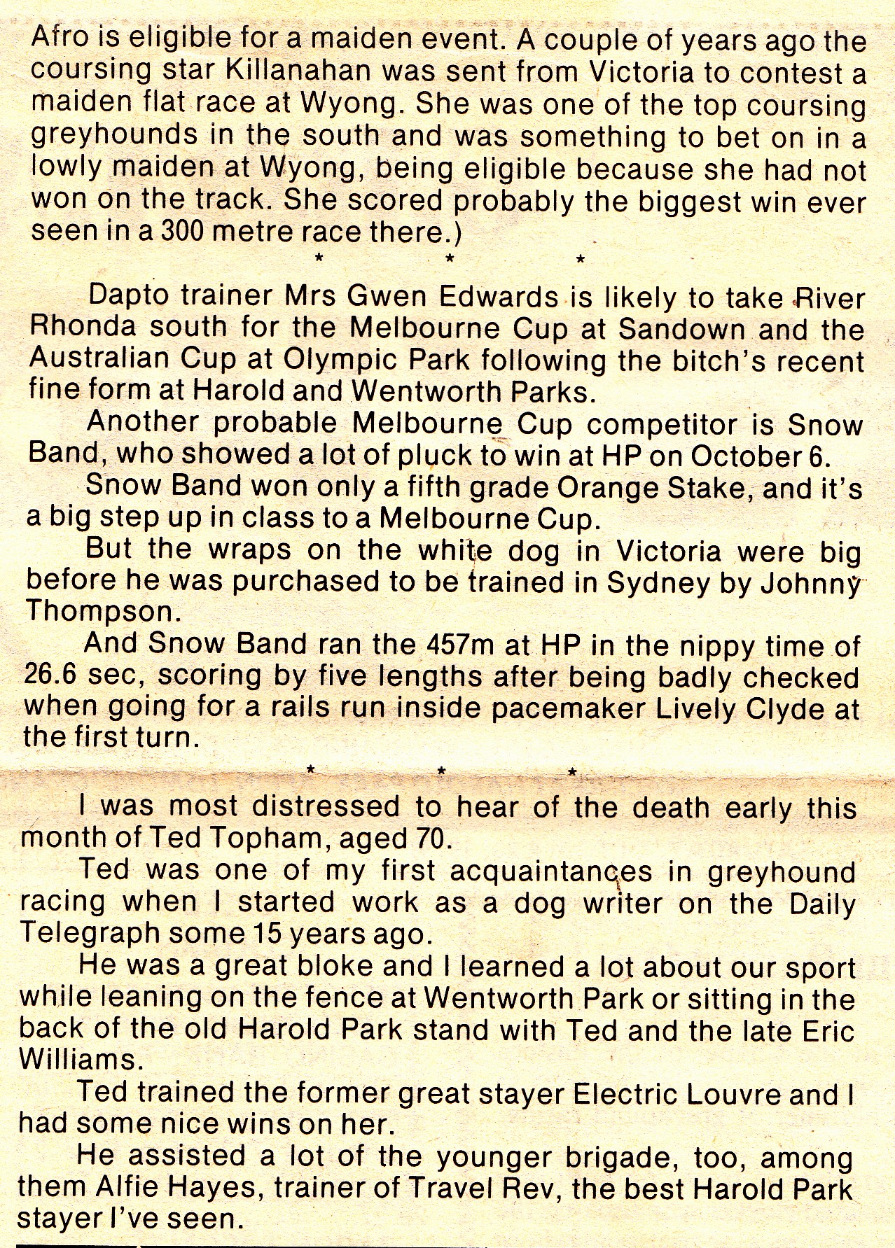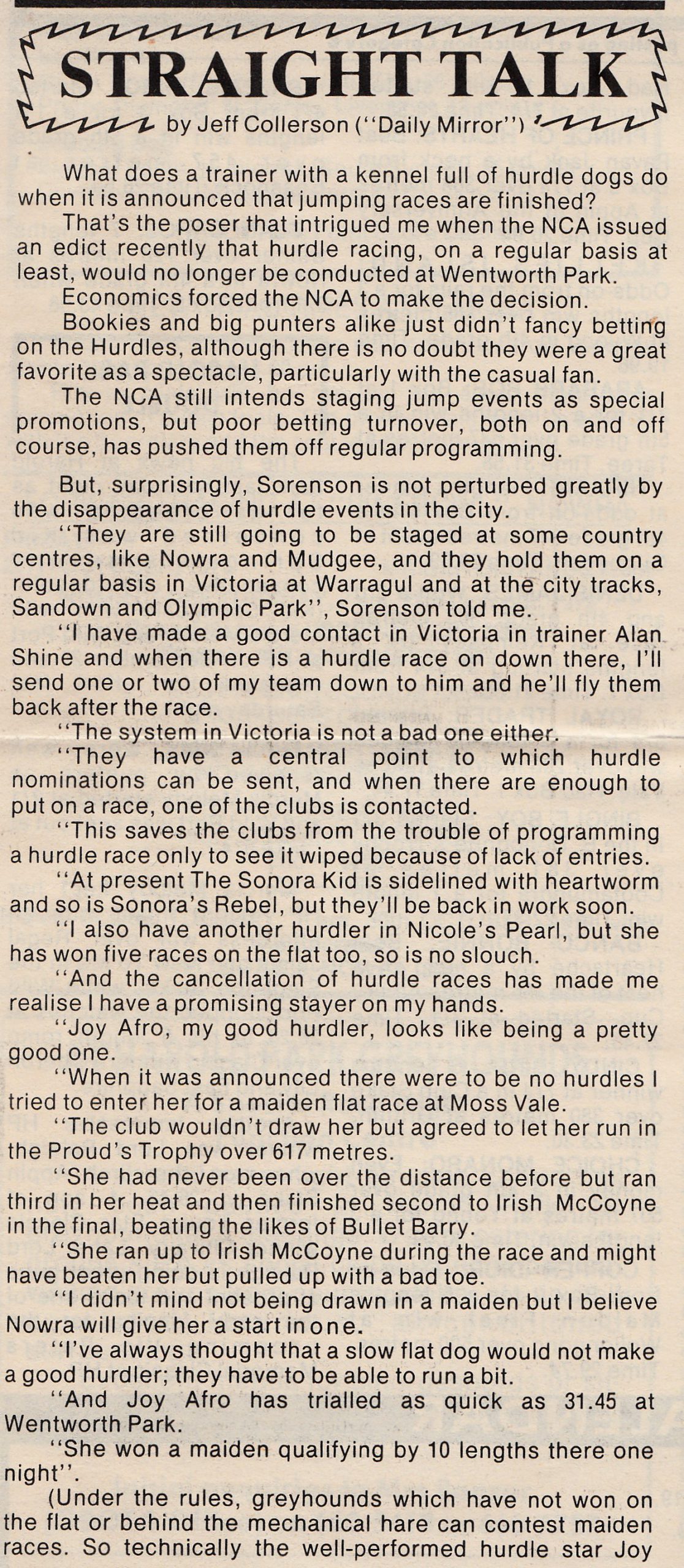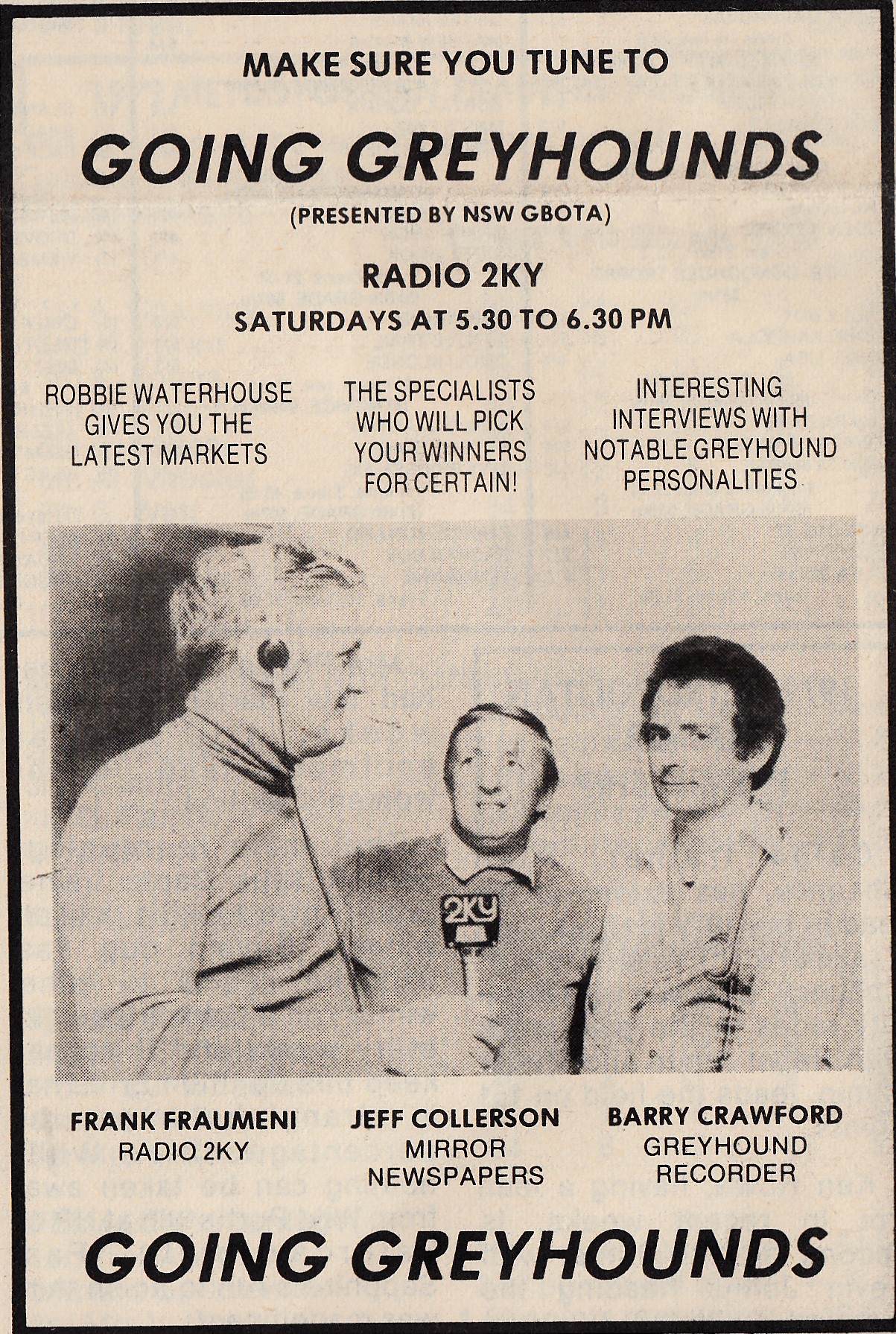 A story about the end of Hurdle Racing in New South Wales October 1979. As reported by the doyen of Greyhound Jono’s Hall of Famer Jeff “Pigeon” Collerson. There isn’t anything he didn’t write for this was in the GBOTA Greyhound Advertiser. Love the ad on the back page for the longest running Greyhound Radio program in history “Going Greyhounds” on 2KY 5.30 to 6.30pm Saturdays in those days. Jeff co-hosted with Frank Fraumeni and Barry Crawford.