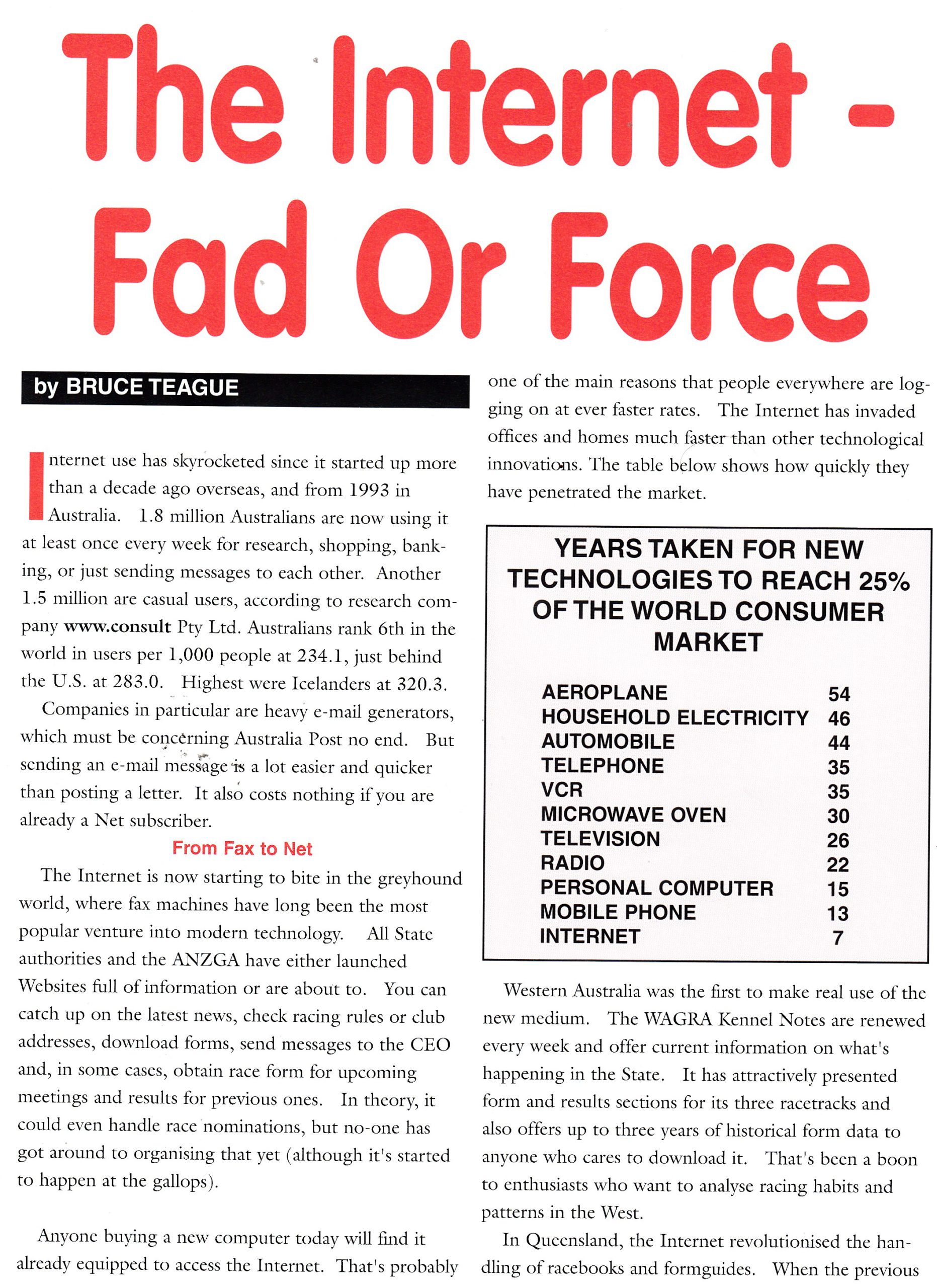 Prolific scribe for many years in many publications Bruce Teague. He wrote this interesting piece on the internet and its possible effect on Greyhound Racing.