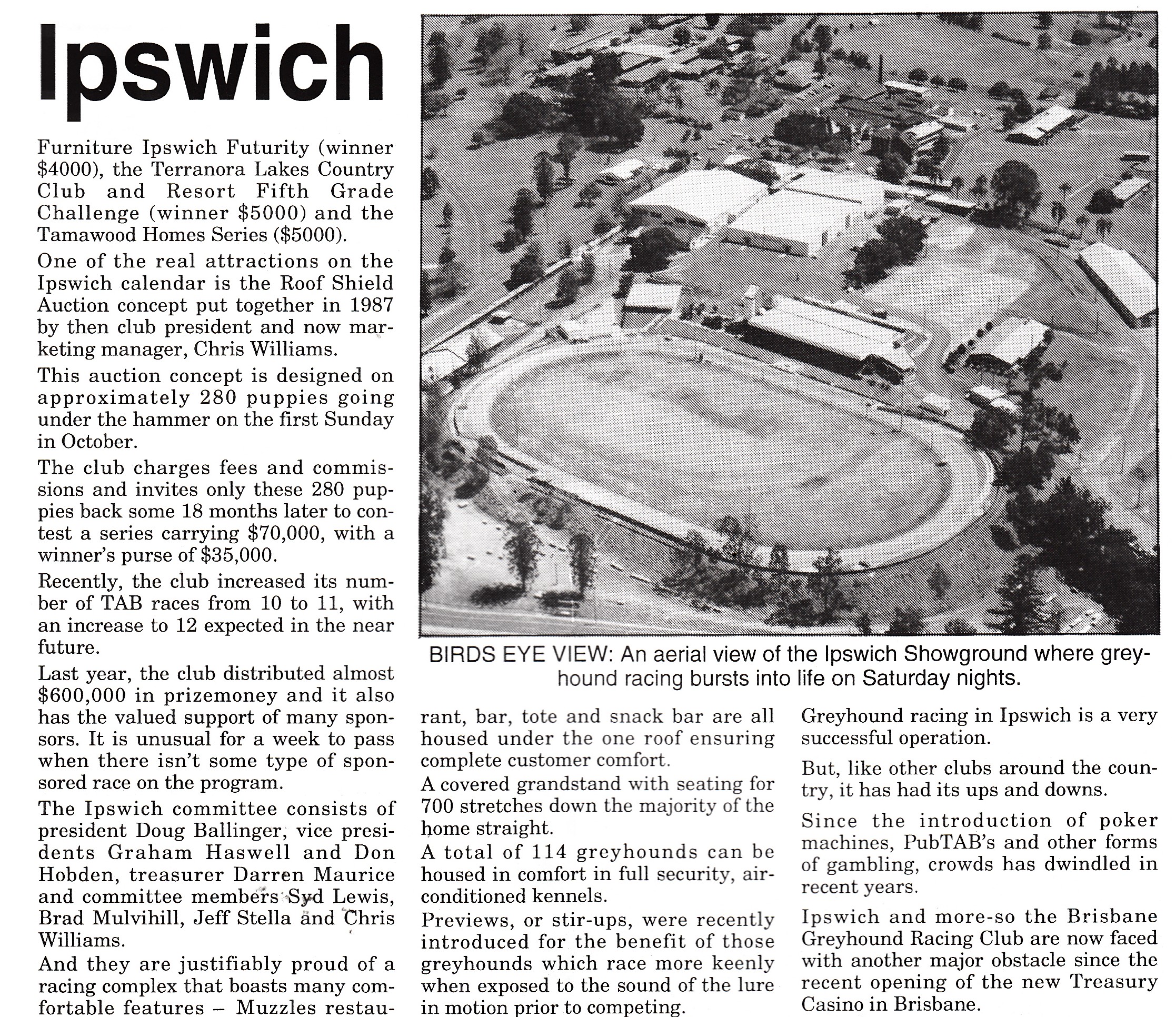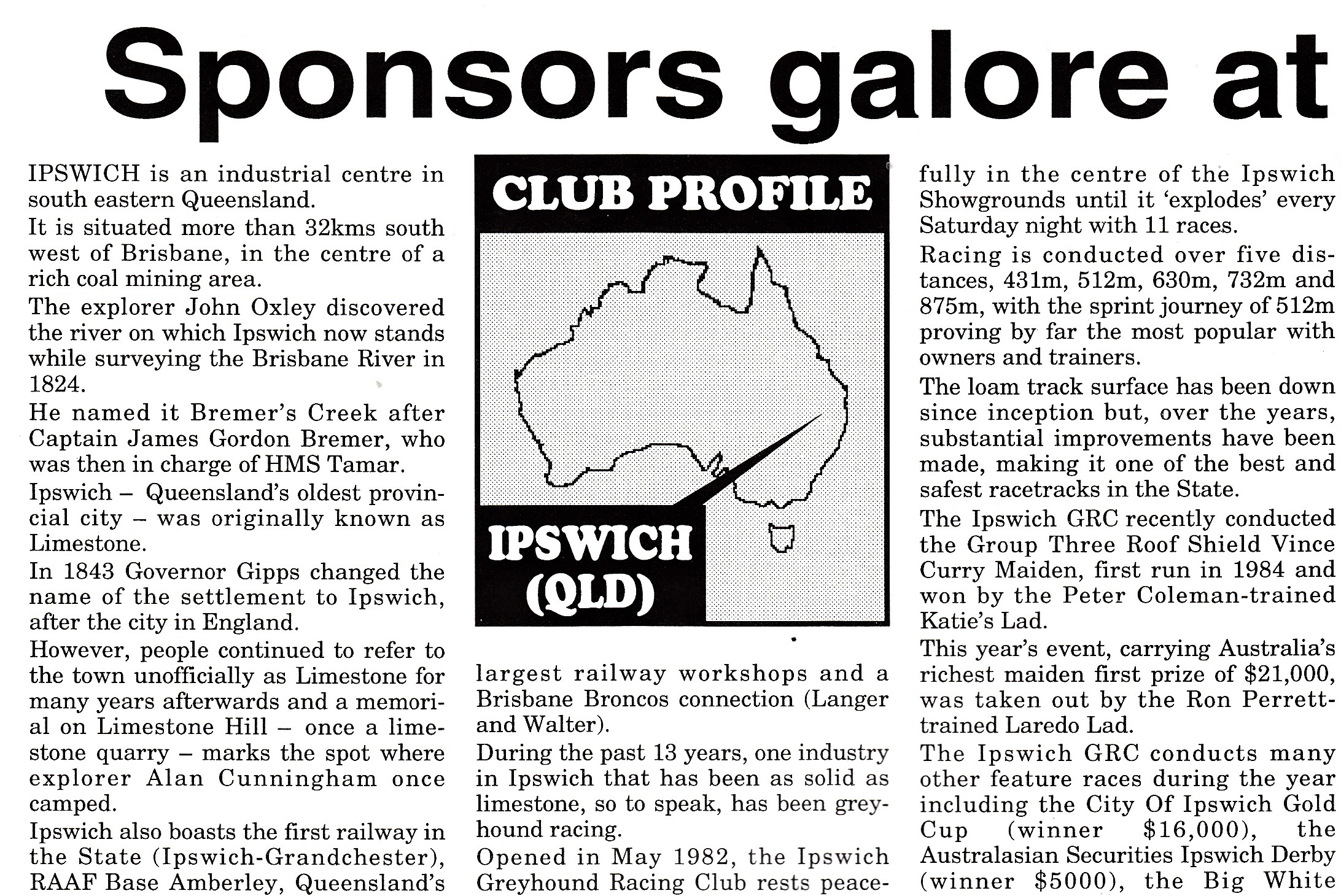COURSE ANNOUNCER: Terry Spargo, radio 4BC. At the time, Terry was also the racecaller at the Gold Coast Turf Club. He would call the horse races there on Saturday afternoon then drive to Ipswich to call the greyhound card. After about twelve months the calling job was handed to Damian Courtney and following callers included Paul Dolan, Michael Wrona, Danny Ryan and John Brasch.
