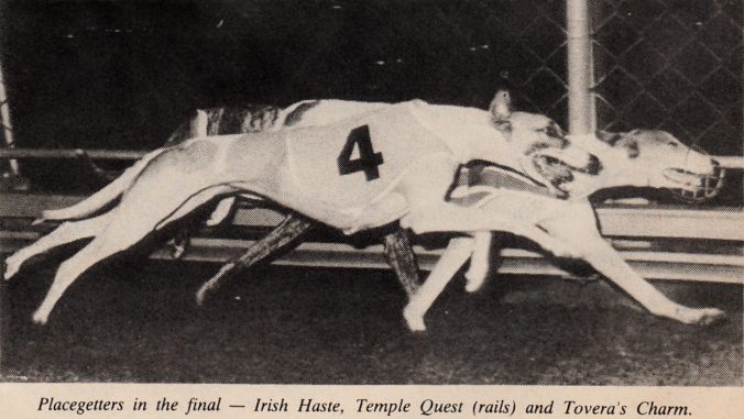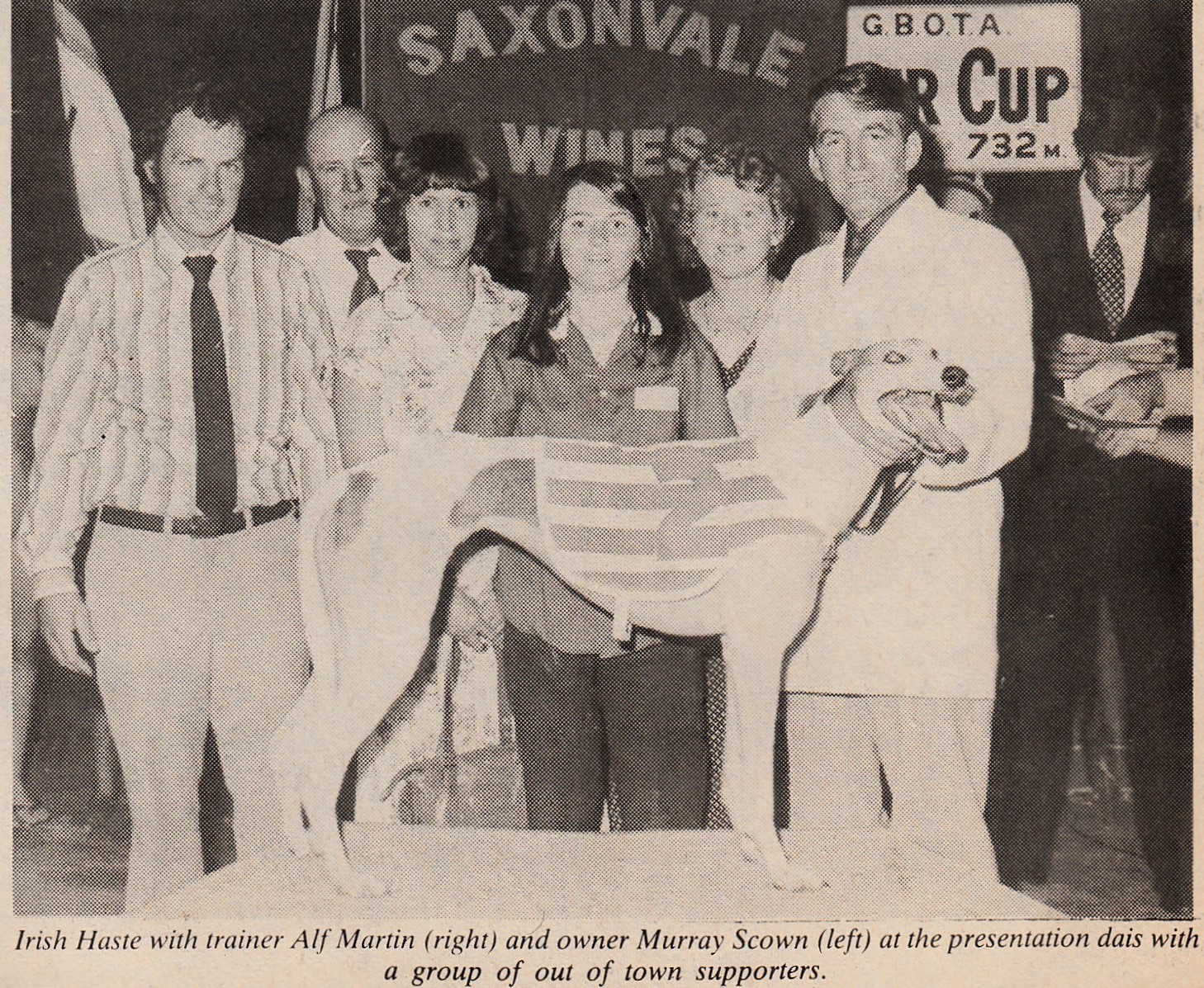 Victorian Irish Haste (Tain Rua x Gwen’s View) winning the 1979 Summer Cup at Harold Park for Murray Scown and Alf Martin. Winners time was 43.29 Alf had finished second in 1972 with Bandwagon John behind Dynabolt.