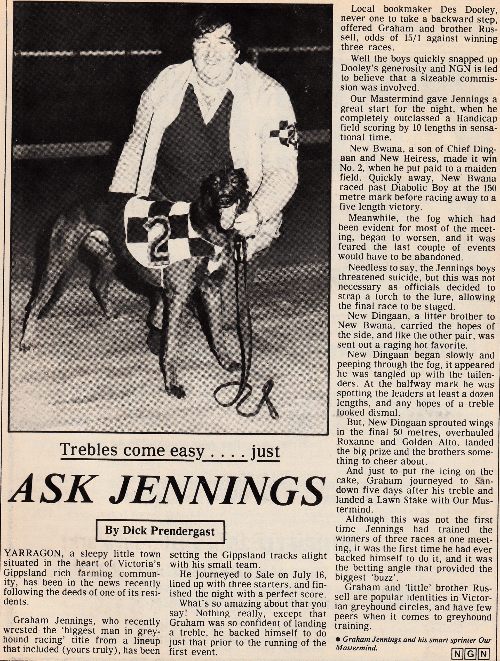 John Stephens – I would like to take the credit Brownie…but that lays with Adam Bailey (then driving lure). He confidently suggested he could drive at 30.00sec pace, irrespective of where the dogs were, as long as he knew where the lure was. Stewards agreed that if so, the dogs would not be too close or too far from the lure. All went well, genius driver in charge of lure!