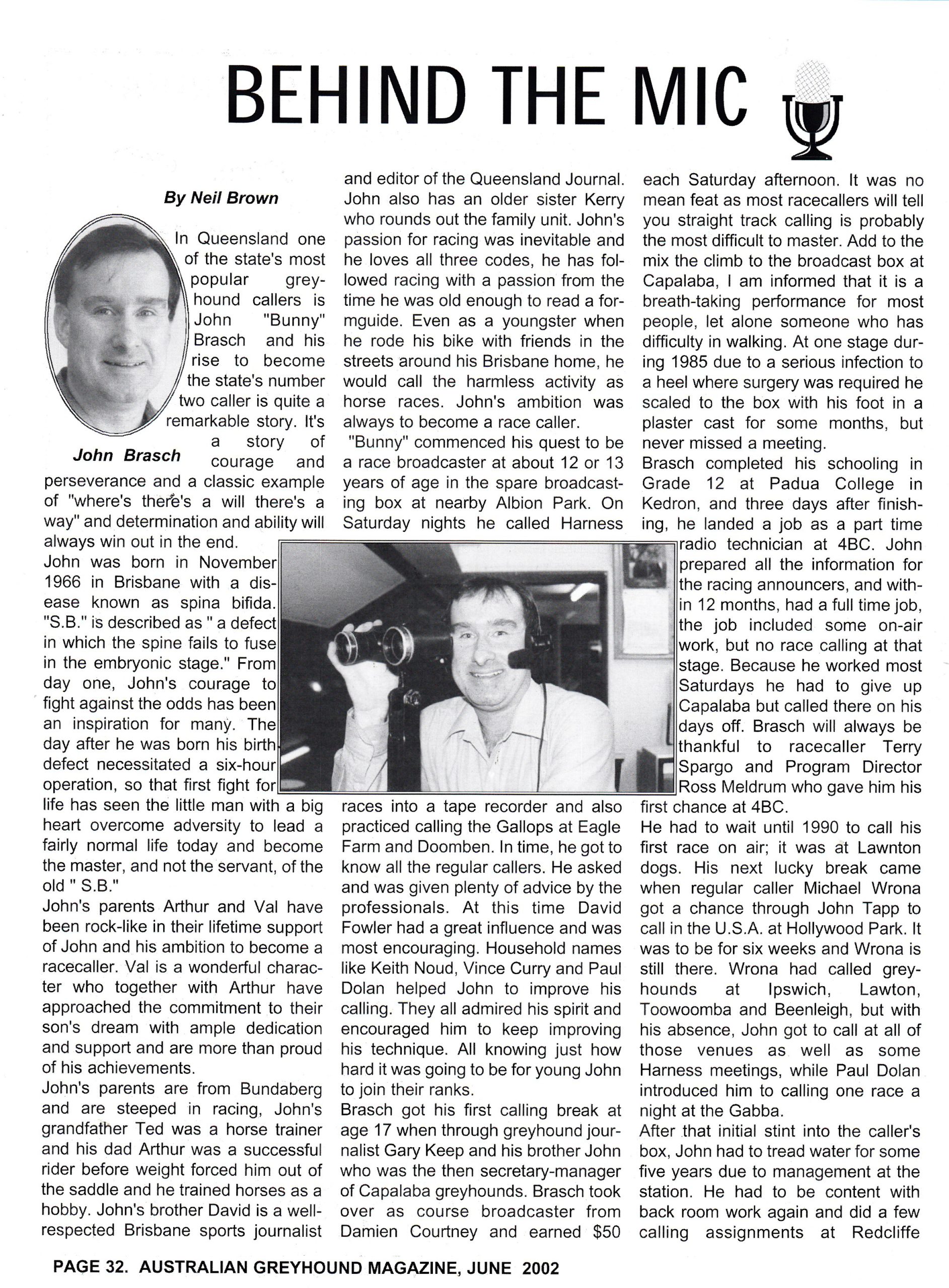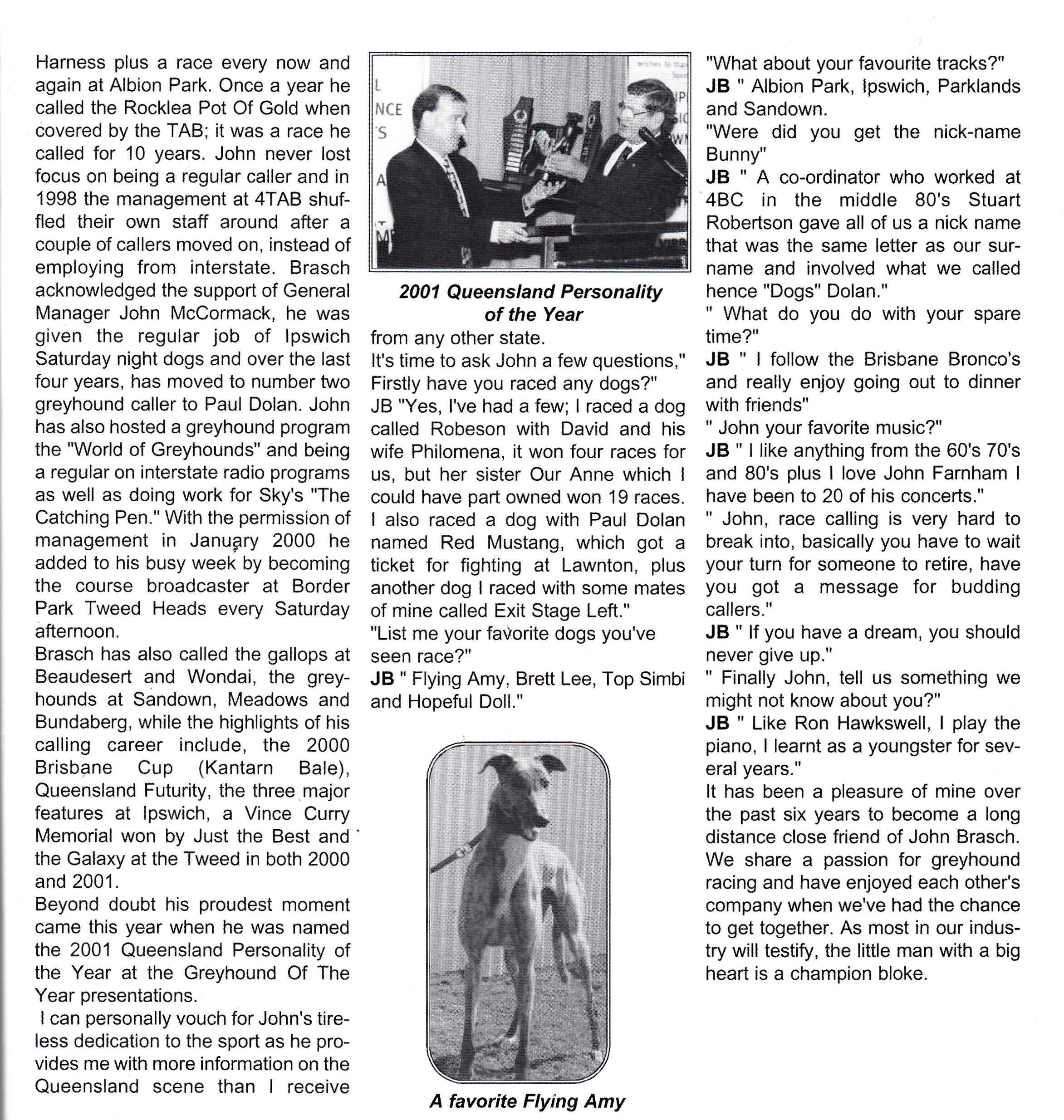 Another great Queenslander my good friend John Brasch receiving the Media Personality of the Year award. Below is a story from Keith Noud Recalls published in 1986. Keith dedicated the last chapter of his book John “Bunny” Brasch. It highlights John’s amazing story of determination and courage to make it and become the number one Greyhound caller in Queensland. I have also added a story I did with John in 2002 from my magazine. After 29 years John and I still remain the best of long distance friends I have tipped on Sandown with John on Queensland Radio for the last three or four years every Thursday. I miss his late parents Arthur and Val who were as nicer people as I have ever had the privilege to spent time with. In all the time I have known John his passion for race calling has never changed. The little man as he has always been is a champion bloke.