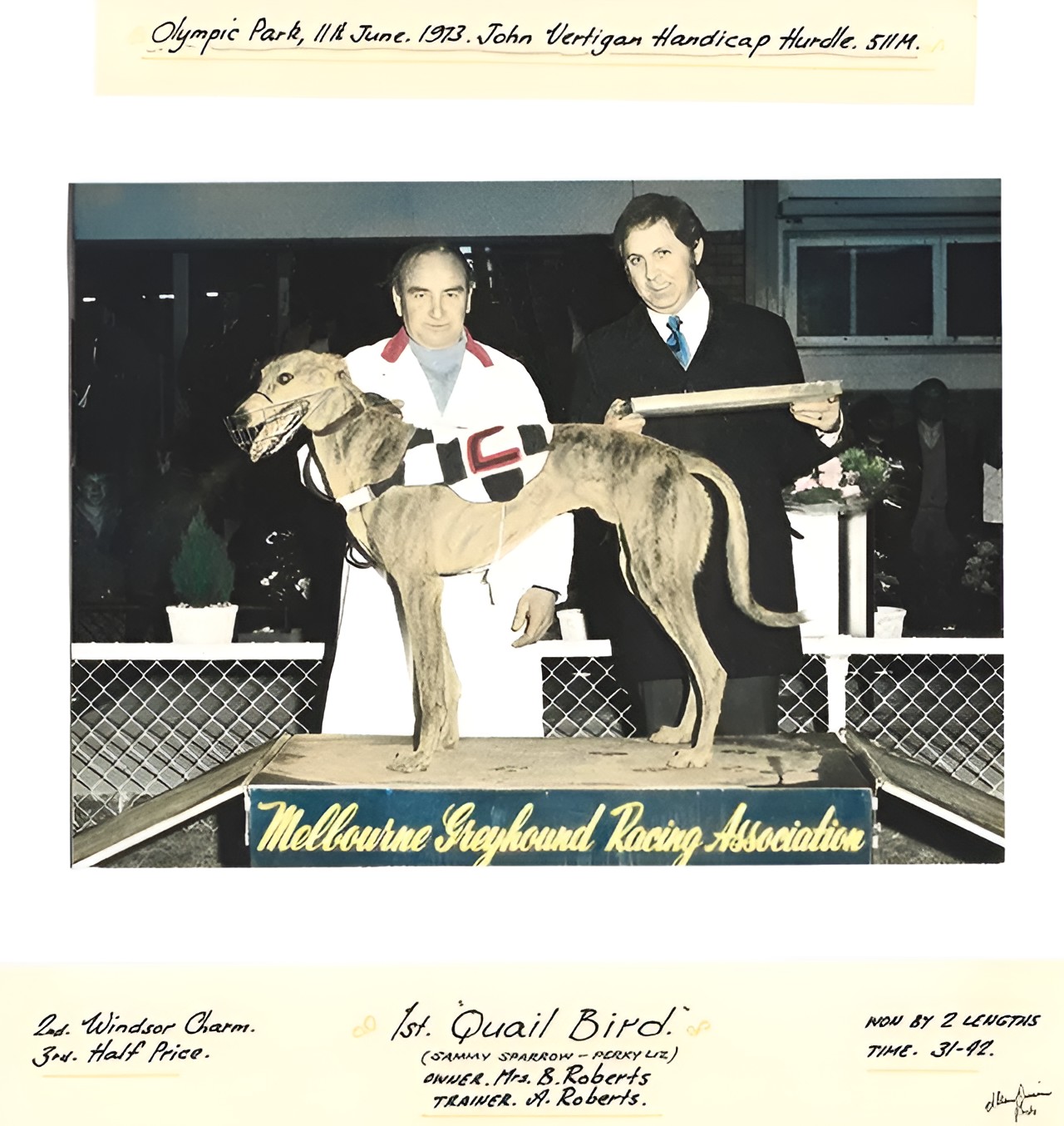 Love this photo of Hall of Fame trainer the late Allan Roberts on the Olympic Park dais with the affectional nicknamed “The Headmaster” Radio veteran, John Vertigan. Vertigan notched up 53 years in the industry, he is a member of the elite half century club. He began broadcasting in 1955 in regional Victoria and, despite all the changes in commercial radio in 53 years, he never worked on the FM side of the dial. His first job was at (then) 3GL in Geelong, followed by Warragul and (then) 7HO, Hobart. From 1963, Vertigan spent 15 years with 3UZ before moving to Sydney, where he was responsible for 2UE’s sporting coverage. He then took on an executive role at the just launched (then) 2WS before returning to Melbourne in 1982 at (then) 3DB. In 1988, Vertigan returned to 3UZ (now Sport 927), where he was chief racing coordinator. Considered the doyen of Race Coordinators I had the chance to work with John when in 1996 I landed the Thursday night 30 minute Program Chasing Extra on Sport927. I was total in awe, and I don’t think he could understand why. But I had been listening to him since the middle 60’s.
