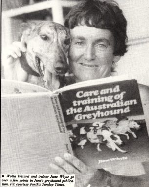 June Whyte with one of her many winners Wotta Wizard after he won the 1982 Anniversary Cup at Angle Park. June’s book Care and Training of the Australian Greyhound one of the best written on the subject. I recall how much I enjoyed it the first time I read it in the 70’s.