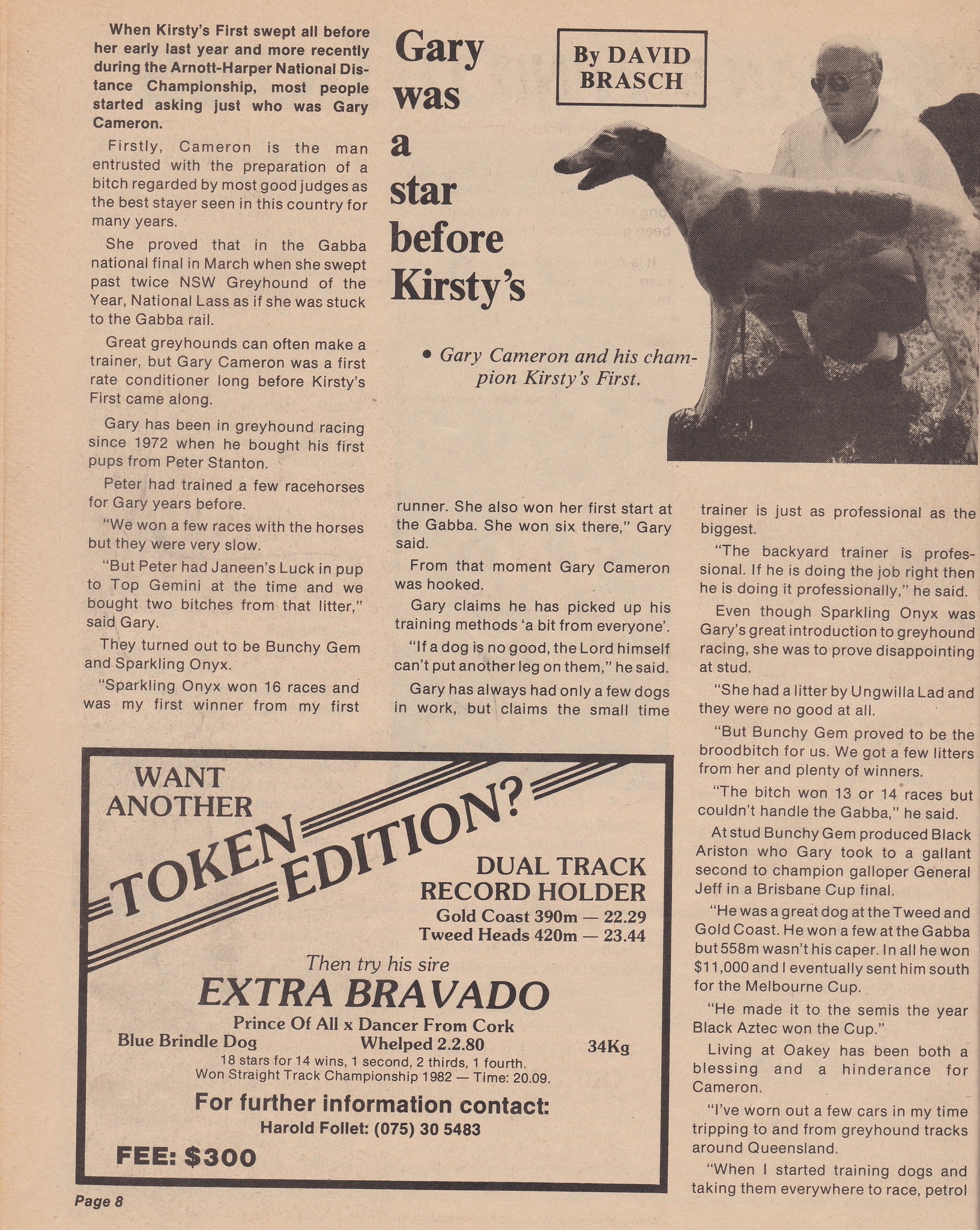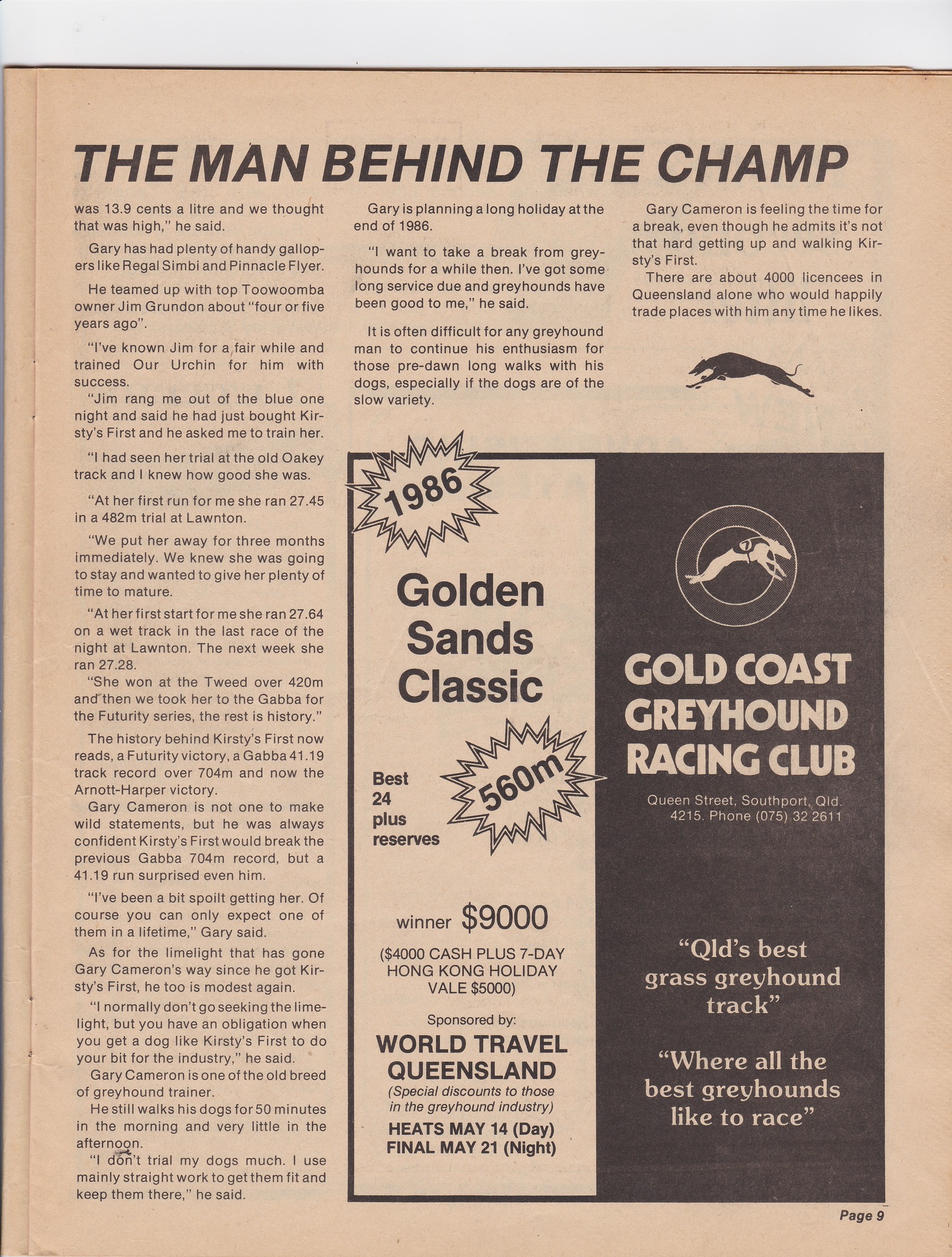 A great story from David Brasch regarding Gary Cameron and 1986 National Distance Championship winner and 2013 QLD Hall Of Fame inductee Kirsty’s First. From Brennan Ryan.