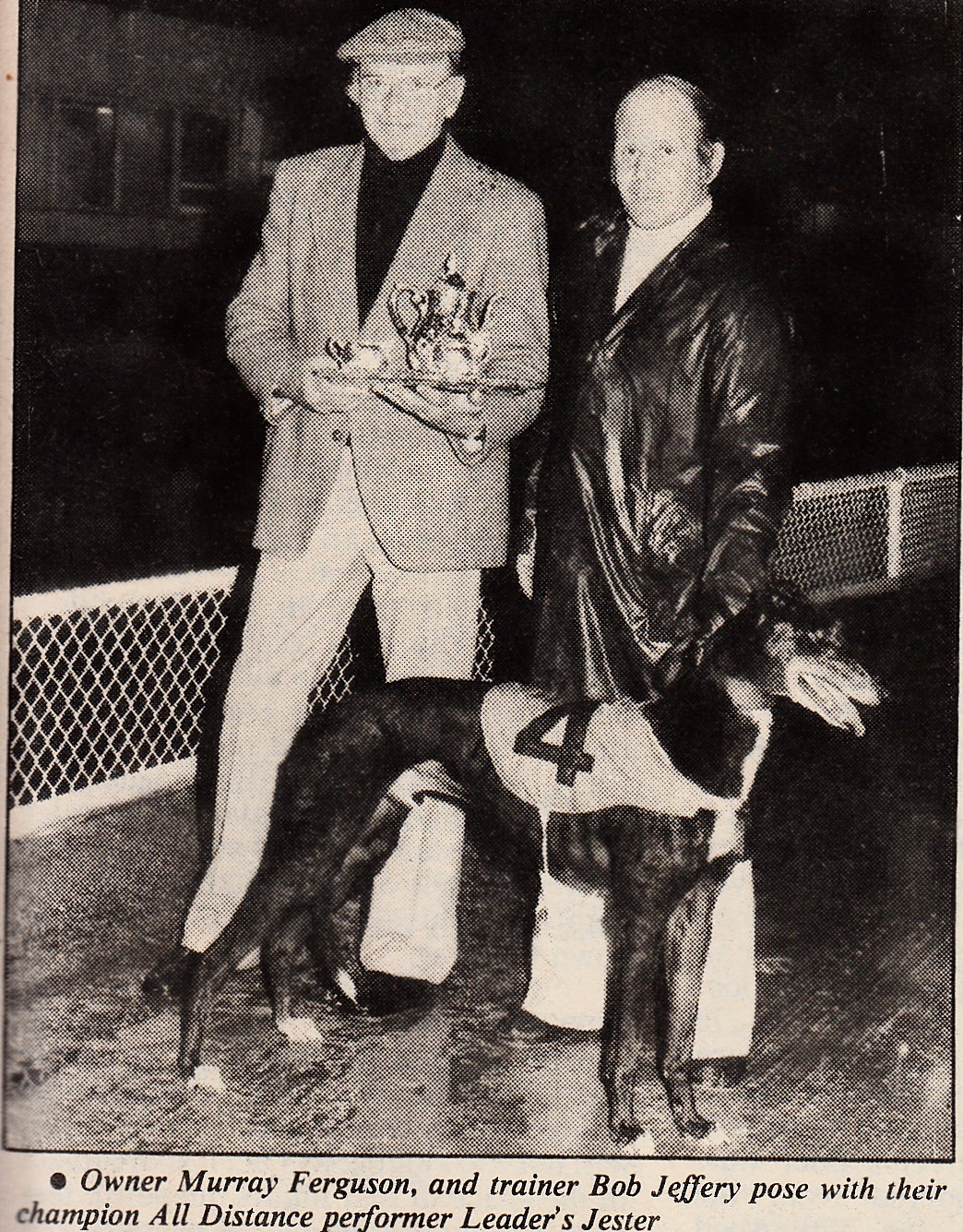 A quick dog (Leaders Champion x Tudor Jester). 1980-81 Victorian Greyhound of the Year. Sandown track record holder 30.09 set in May 1980. Winner of 31 races,9 on end, 20 Best of the night. Stood at stud for Fred Booth. 27 city wins 30.09 and 43.51 at Sandown. 44.19 at Olympic Park and 43.21 for the 732 at Harold Park.