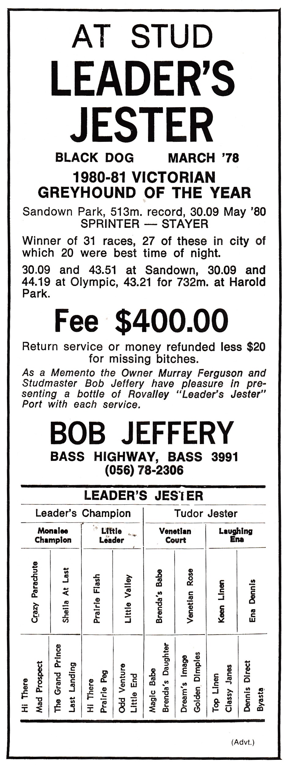 A quick dog (Leaders Champion x Tudor Jester). 1980-81 Victorian Greyhound of the Year. Sandown track record holder 30.09 set in May 1980. Winner of 31 races,9 on end, 20 Best of the night. Stood at stud for Fred Booth. 27 city wins 30.09 and 43.51 at Sandown. 44.19 at Olympic Park and 43.21 for the 732 at Harold Park.