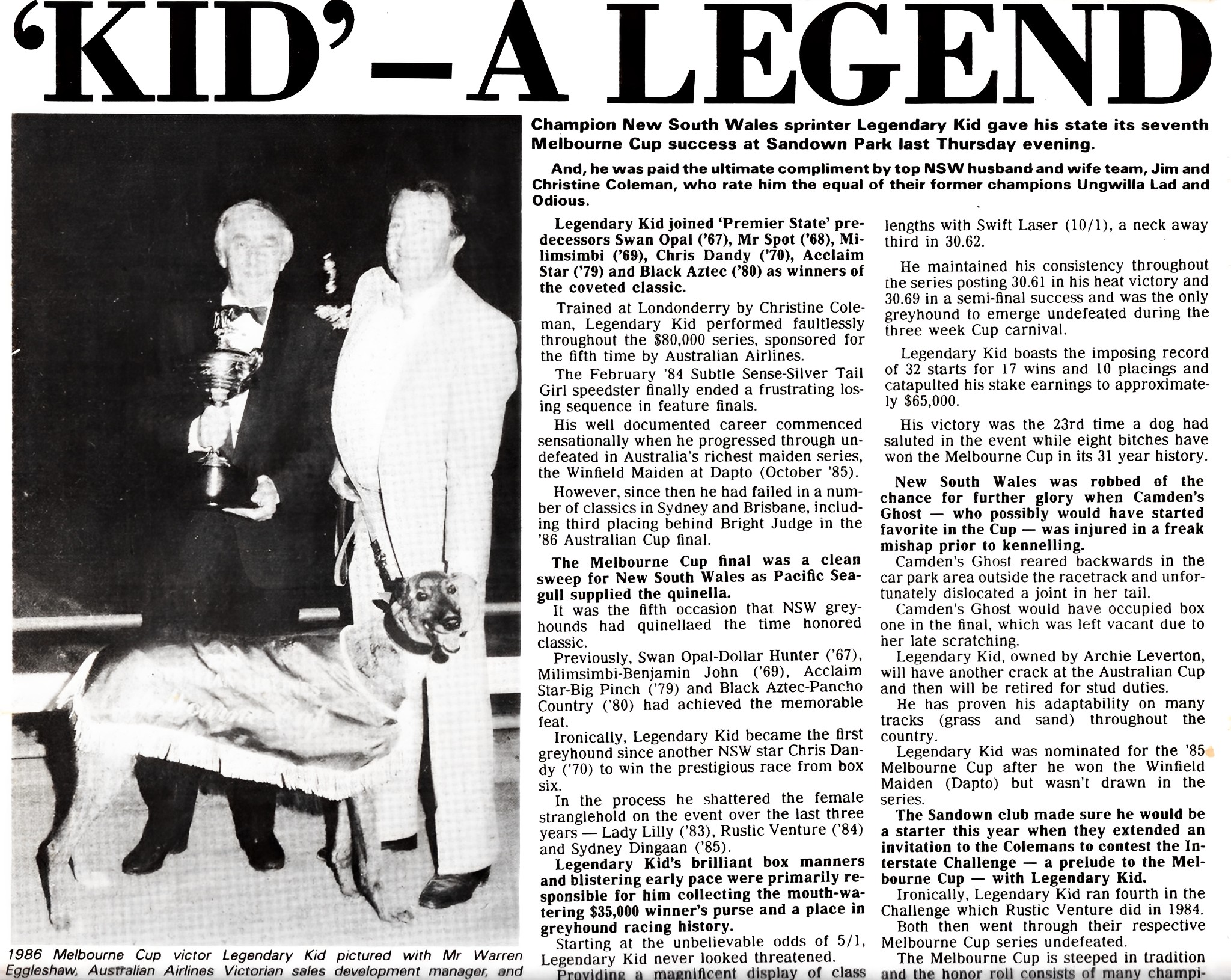 I will never for arriving on course for the 1986 Melbourne Cup to hear the news race favourite from box 1 Camdens Ghost had been scratched after a mishap in the car park when she dislocated her tail. It left the race wide open for Jim and Christine Coleman’s Legendary Kid to lead most of the way. He was a great dog for them. I also remember watching the Cup in the Unfinished Grandstand sitting on concreate with Bob Douglas. Here is an interview I did with Jim and Christine at Tweed Heads.