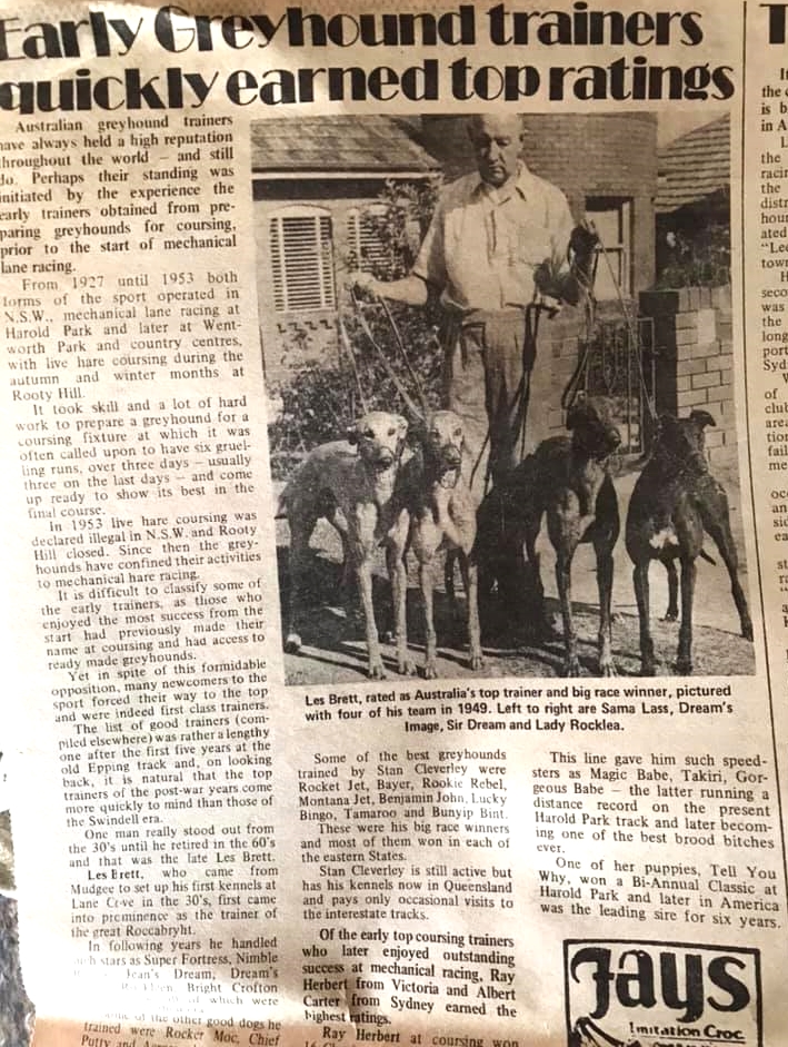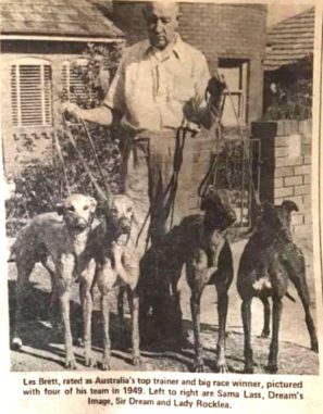 Australian greyhound trainers have always been highly rated worldwide. Here is a story featuring the late Les Brett from Mudgee in New South Wales. Les was an outstanding trainer for an extended period of time both in the coursing ranks and track racing. He is pictured here with a few of his stars including Dreams Image the Greyhound that retired as Australia’s highest stakes earner with 3003 pounds. Dreams Image also produced the mighty Rookie Rebel and was very significant in the stud ranks of the 1960s.