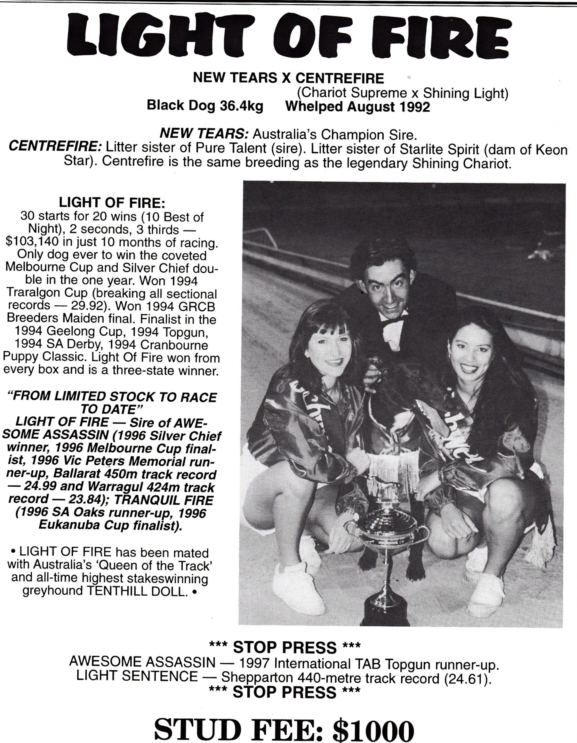 Light Of Fire super race dog and sensational sire. Produced 2153 pups a Sire of Sires. Awesome Assassin, Kantarn Bale (Who knows what he would have produced at Stud) Big Smig, Solve The Puzzle, Dutchy’s Angel, Fenceline, Tranquil Fire, Junoesque. Just to name a few. Great dog.