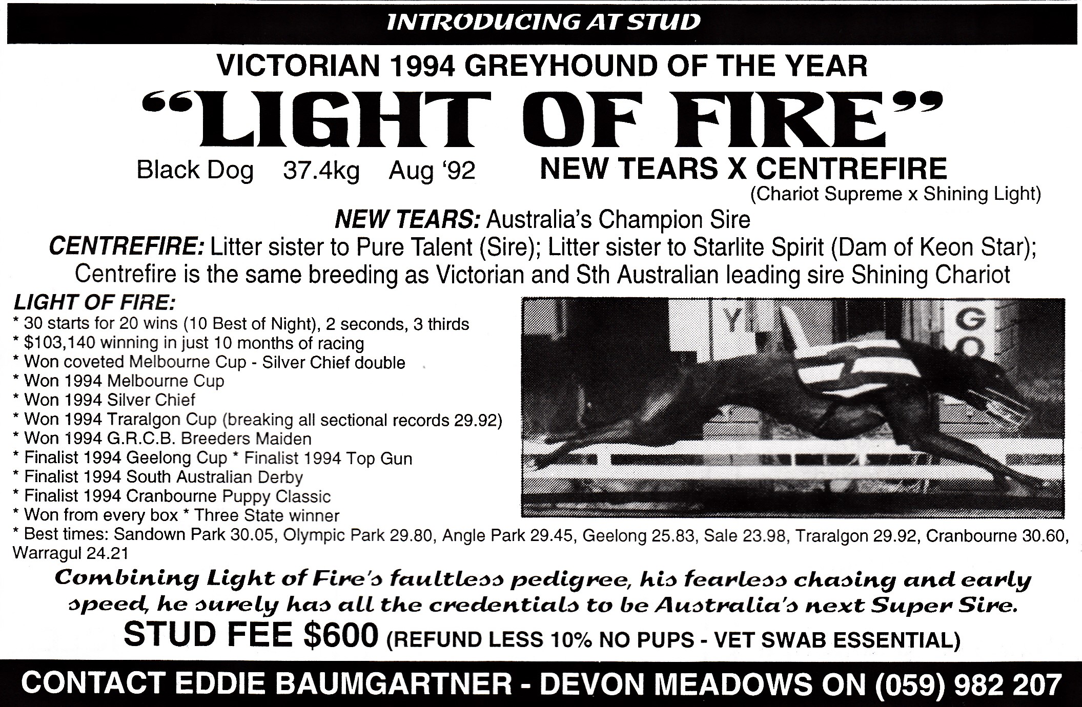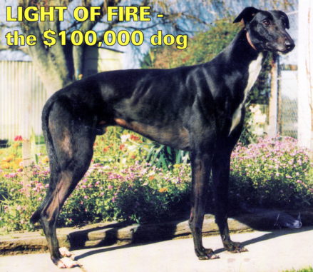 Light Of Fire super race dog and sensational sire. Produced 2153 pups a Sire of Sires. Awesome Assassin, Kantarn Bale (Who knows what he would have produced at Stud) Big Smig, Solve The Puzzle, Dutchy’s Angel, Fenceline, Tranquil Fire, Junoesque. Just to name a few. Great dog.